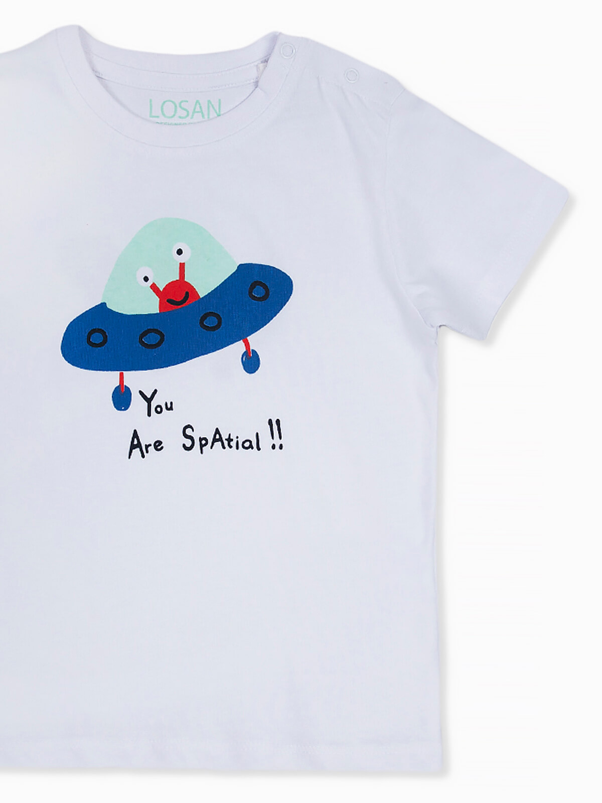T-shirt de manga curta com estampado de nave na frente e atrás. T-shirt em 100% algodão com gola redonda e aperto de 2 botões de pressão.