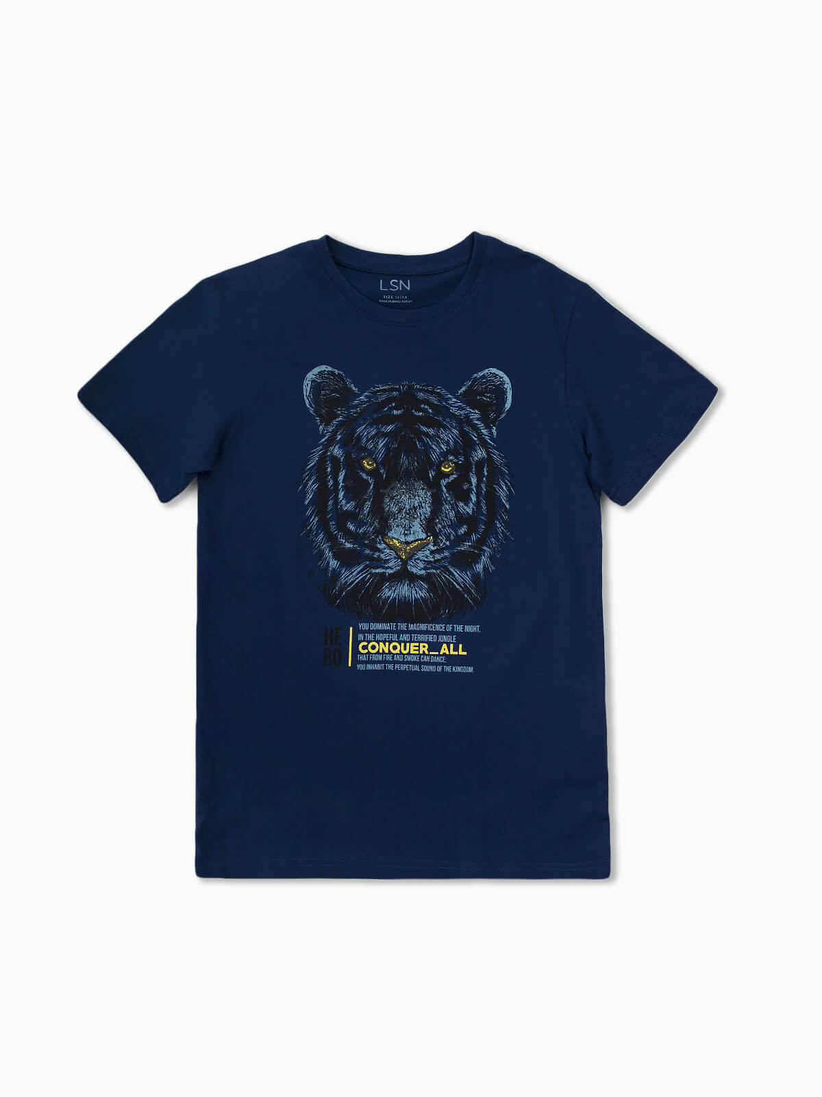 T-shirt de manga curta com estampado de tigre para menino. T-shirt em 100% algodão de gola redonda.