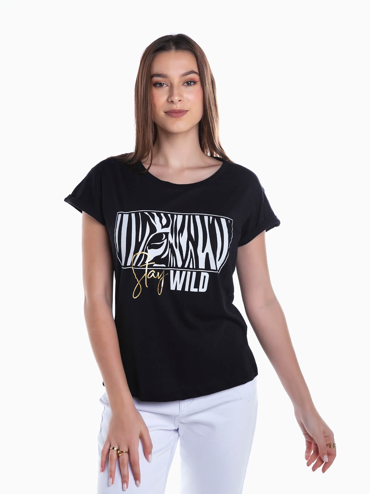 T-shirt de manga curta com estampado zebra e letras no peito. T-shirt em tecido 100% algodão com decote redondo.