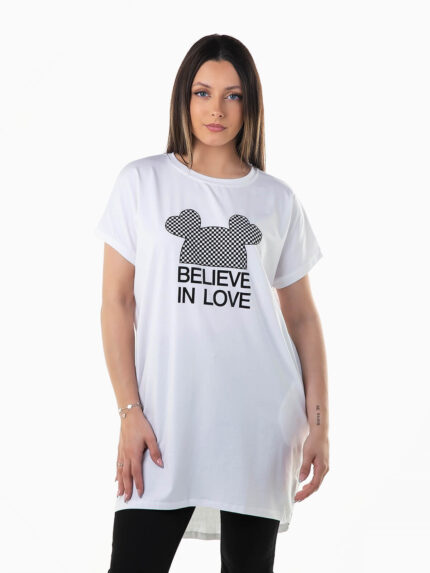 T-shirt de manga curta com flor em tule e renda aplicada no peito. T-shirt para mulher com decote redondo.