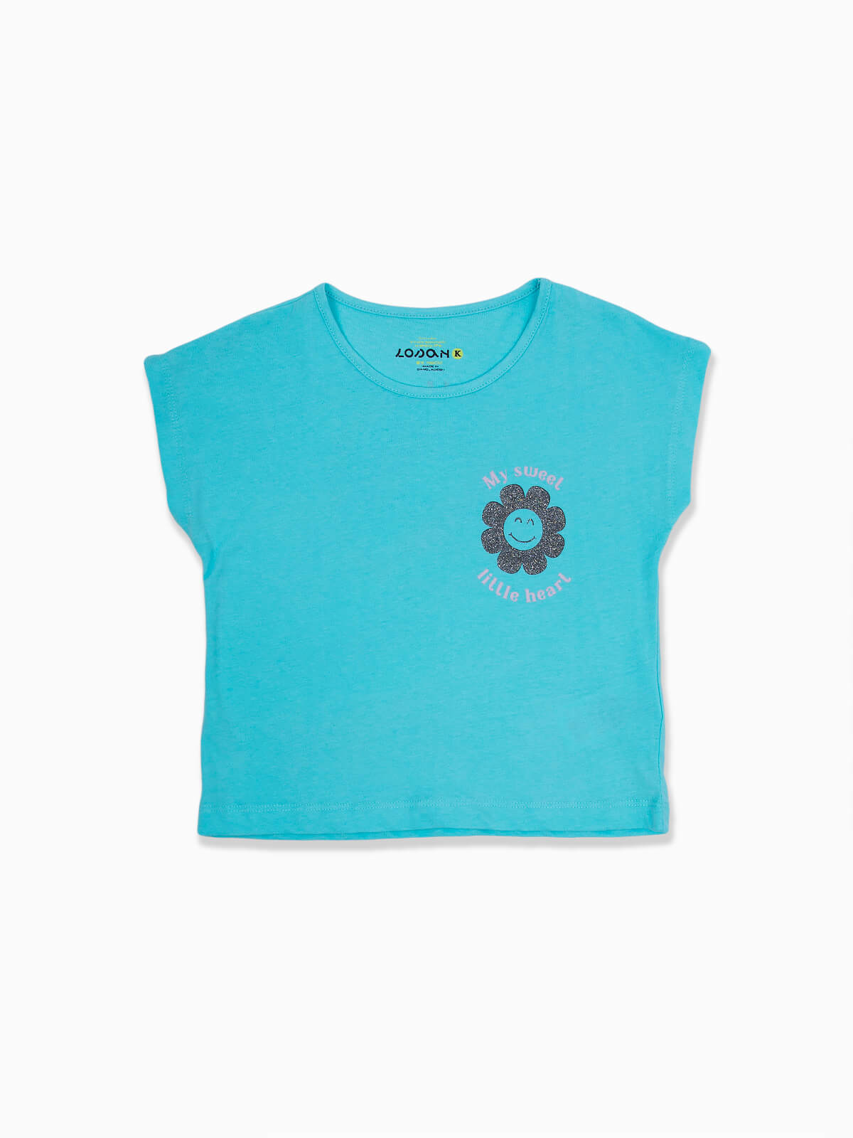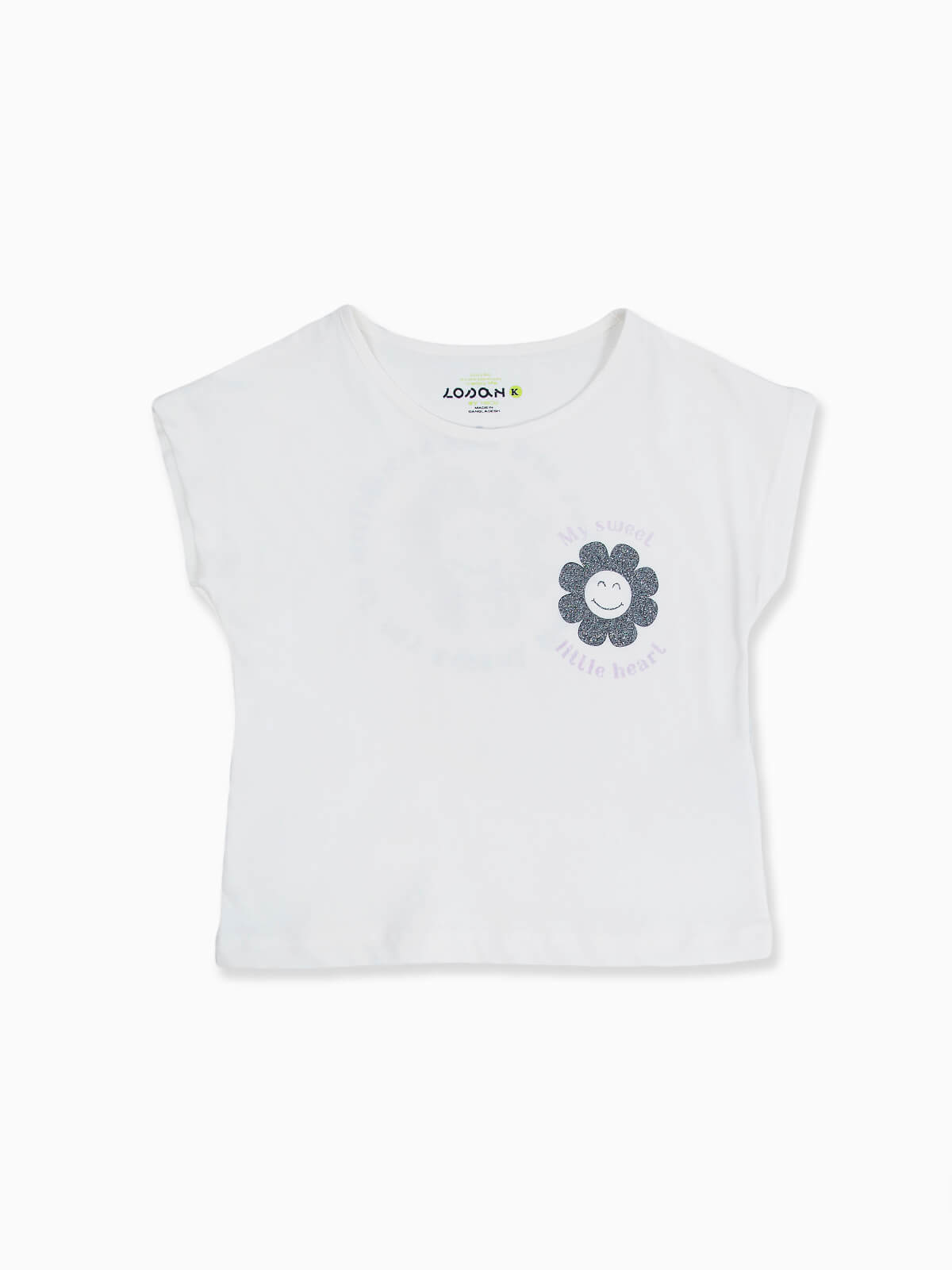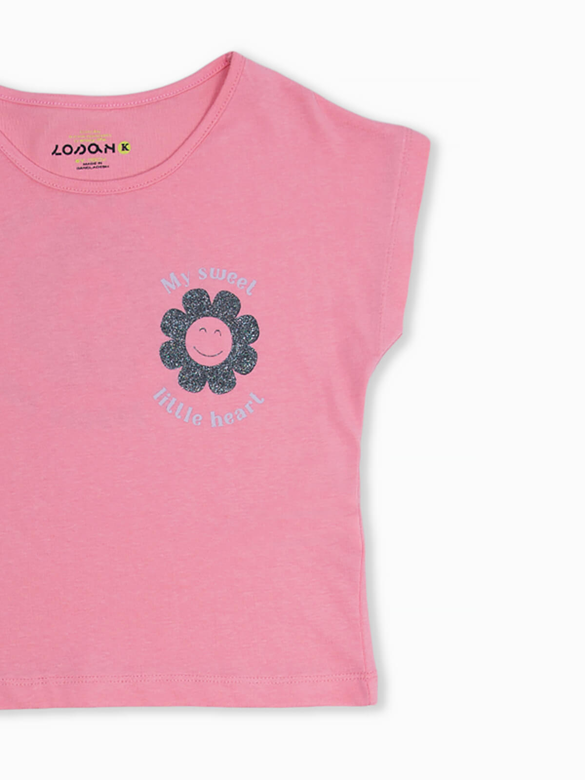 T-shirt de manga curta com estampado de flor brilhante no peito e parte posterior. T-shirt para menina em tecido 100% algodão com decote redondo.