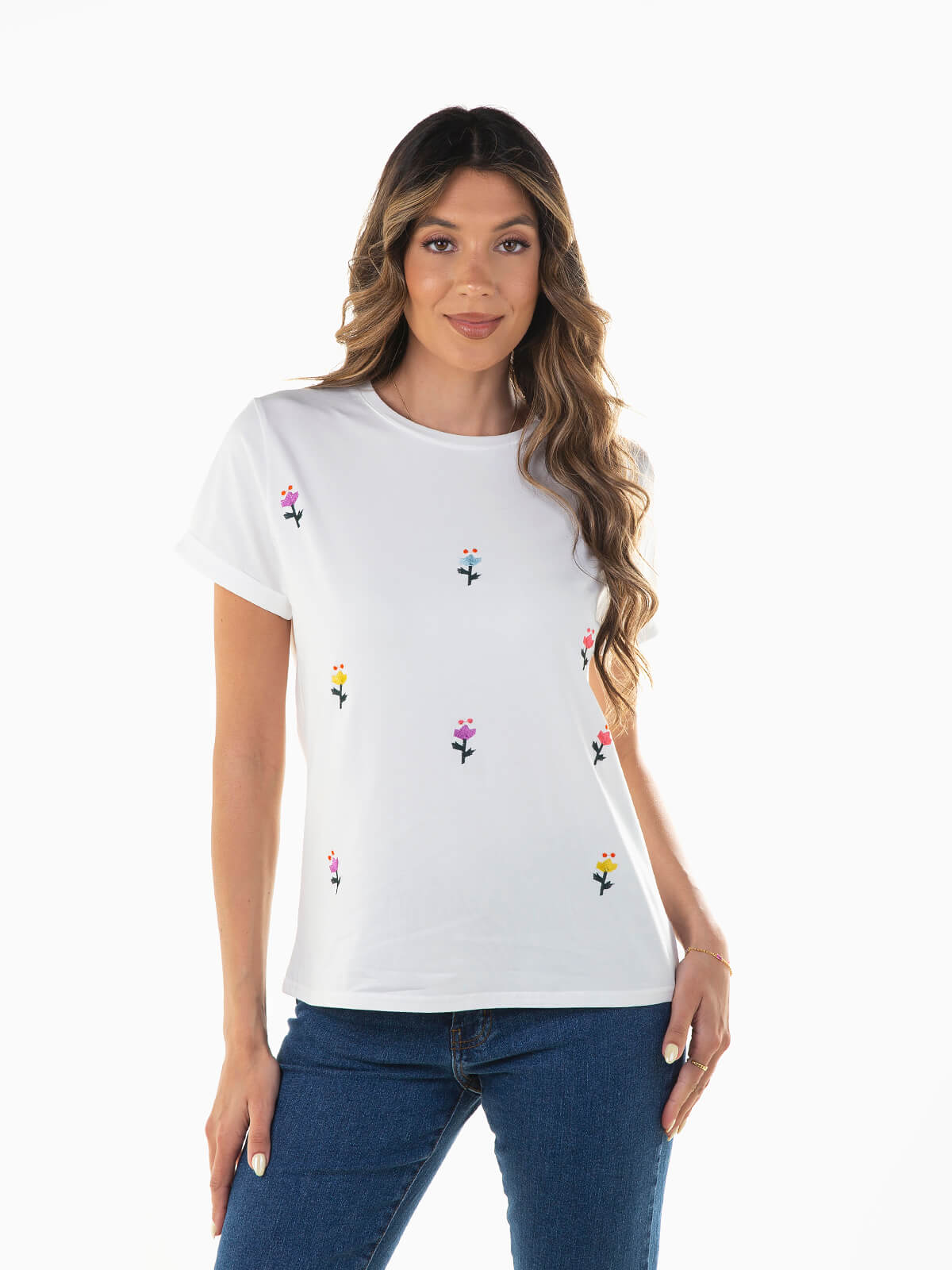 T-shirt de manga curta com flores bordadas em contraste. T-shirt para mulher com decote redondo.
