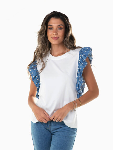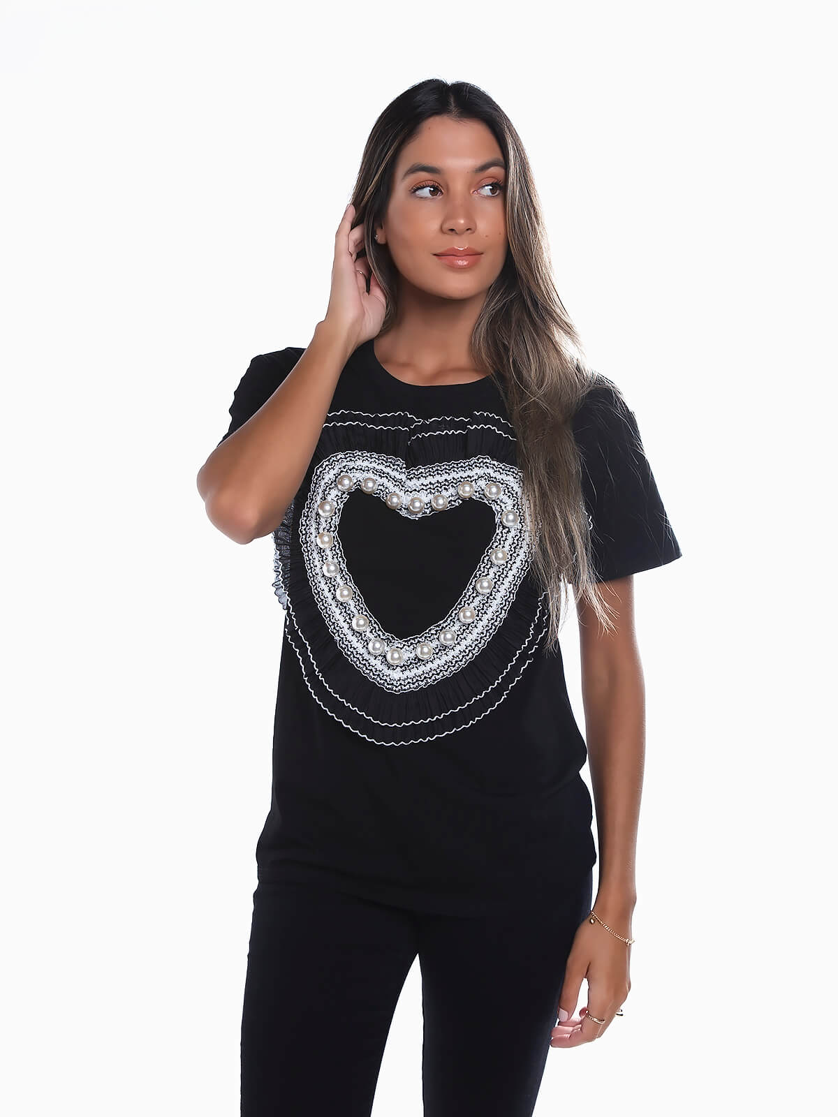 T-shirt de manga curta com folhos aplicados em forma de coração. Pérolas aplicadas. Decote redondo.
