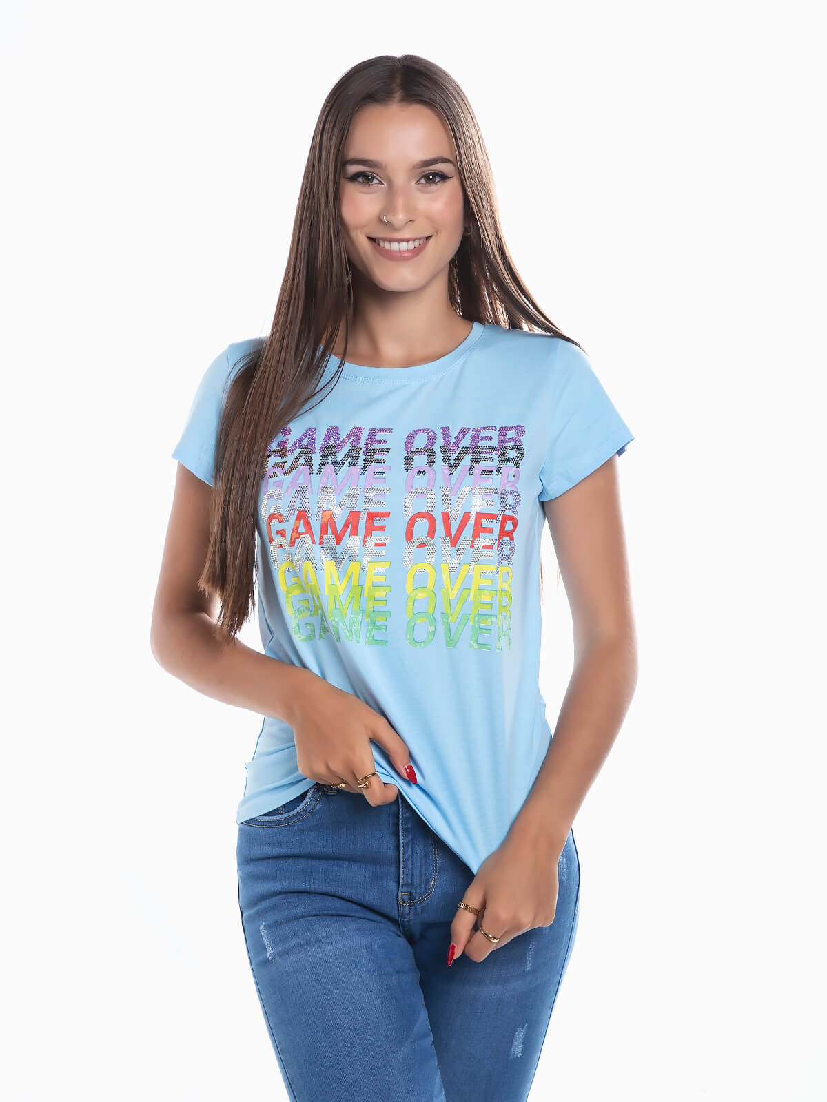 T-shirt de manga curta com estampado Game Over em brilhantes. T-shirt com decote redondo.