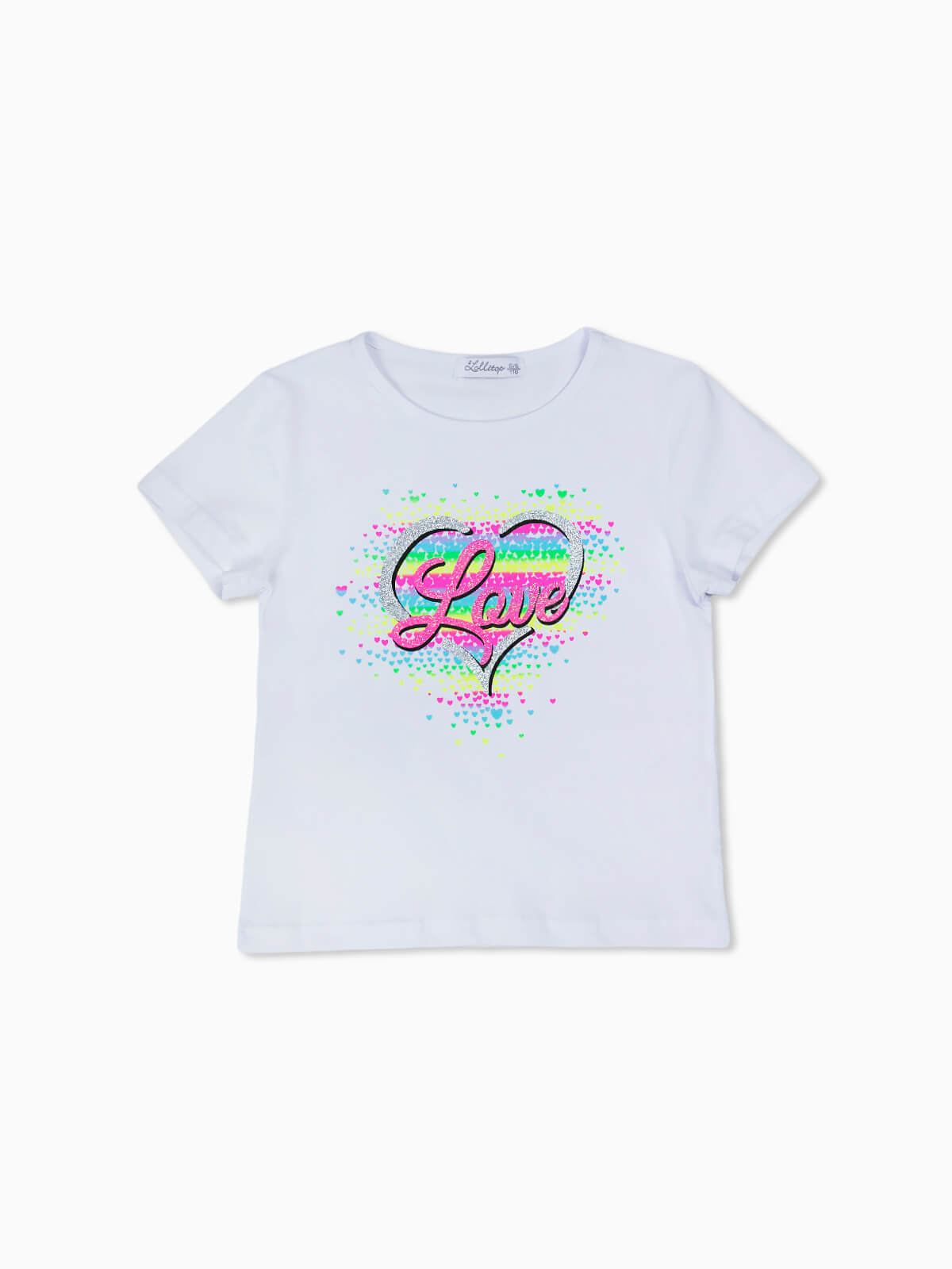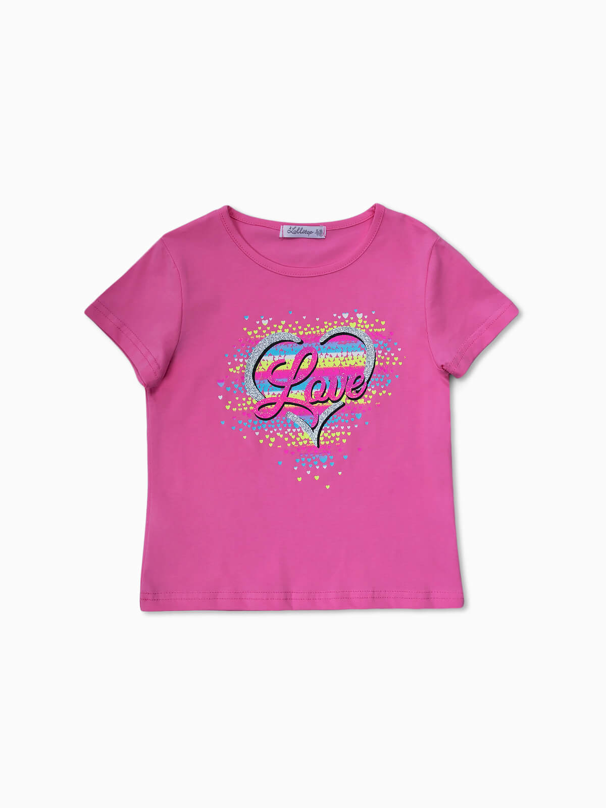T-shirt de manga curta com glitter e estampado de coração em cores neón. T-shirt com gola redonda.