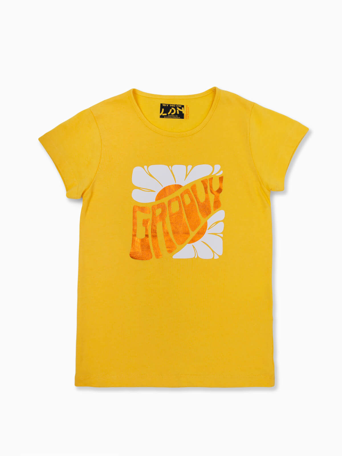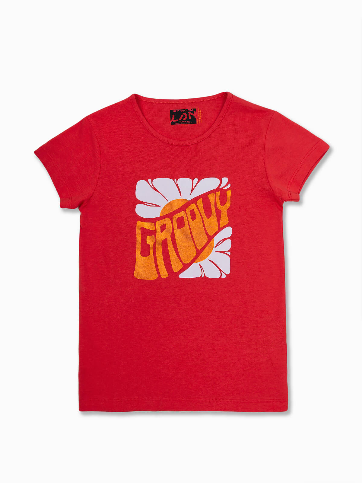 T-shirt de manga curta com estampado ‘Groovy’ brilhante. T-shirt para menina com decote redondo.