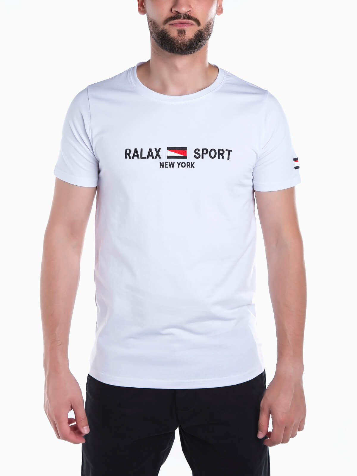 T-shirt de manga curta com letras bordadas no peito. T-shirt para homem com gola redonda.