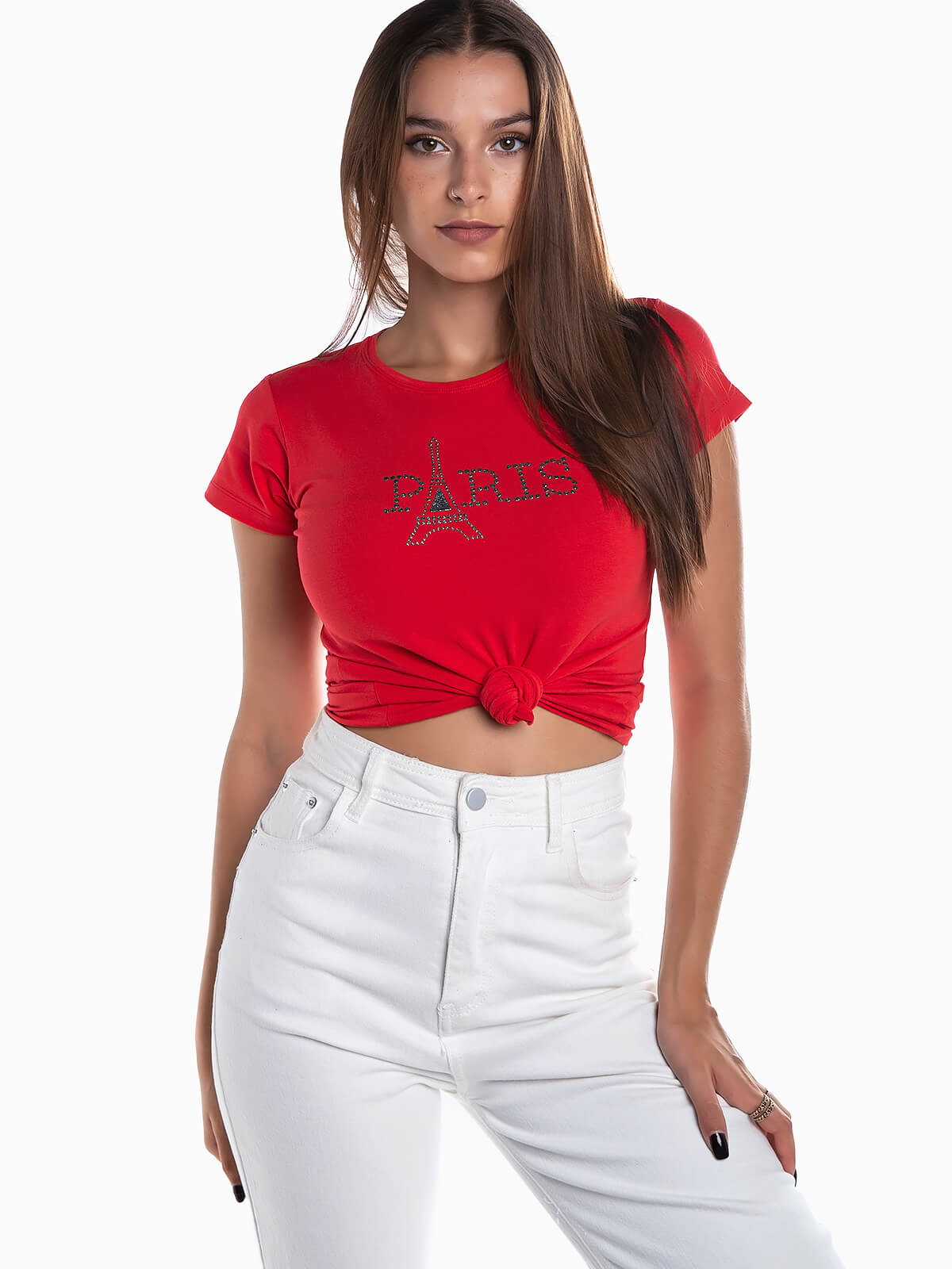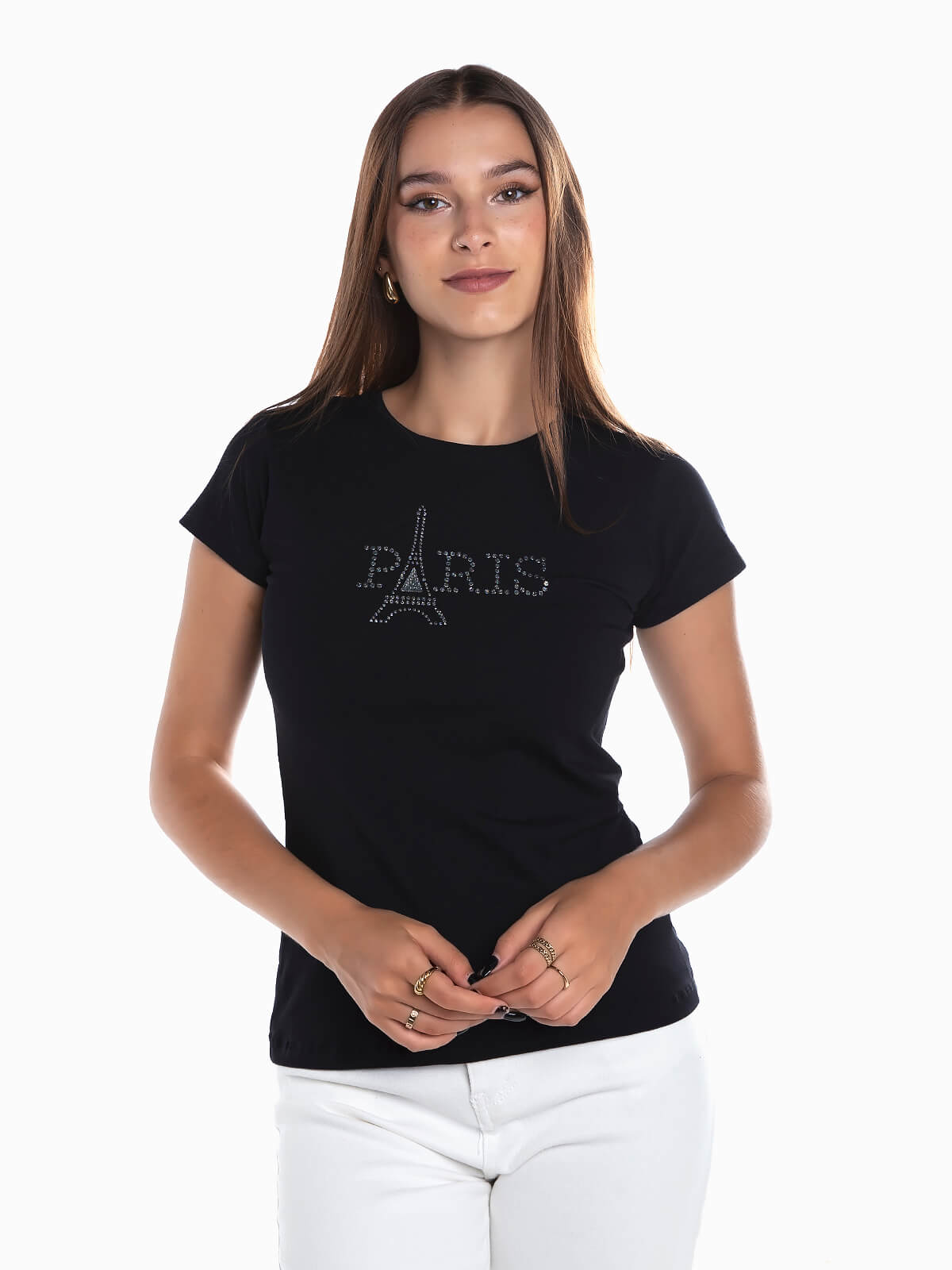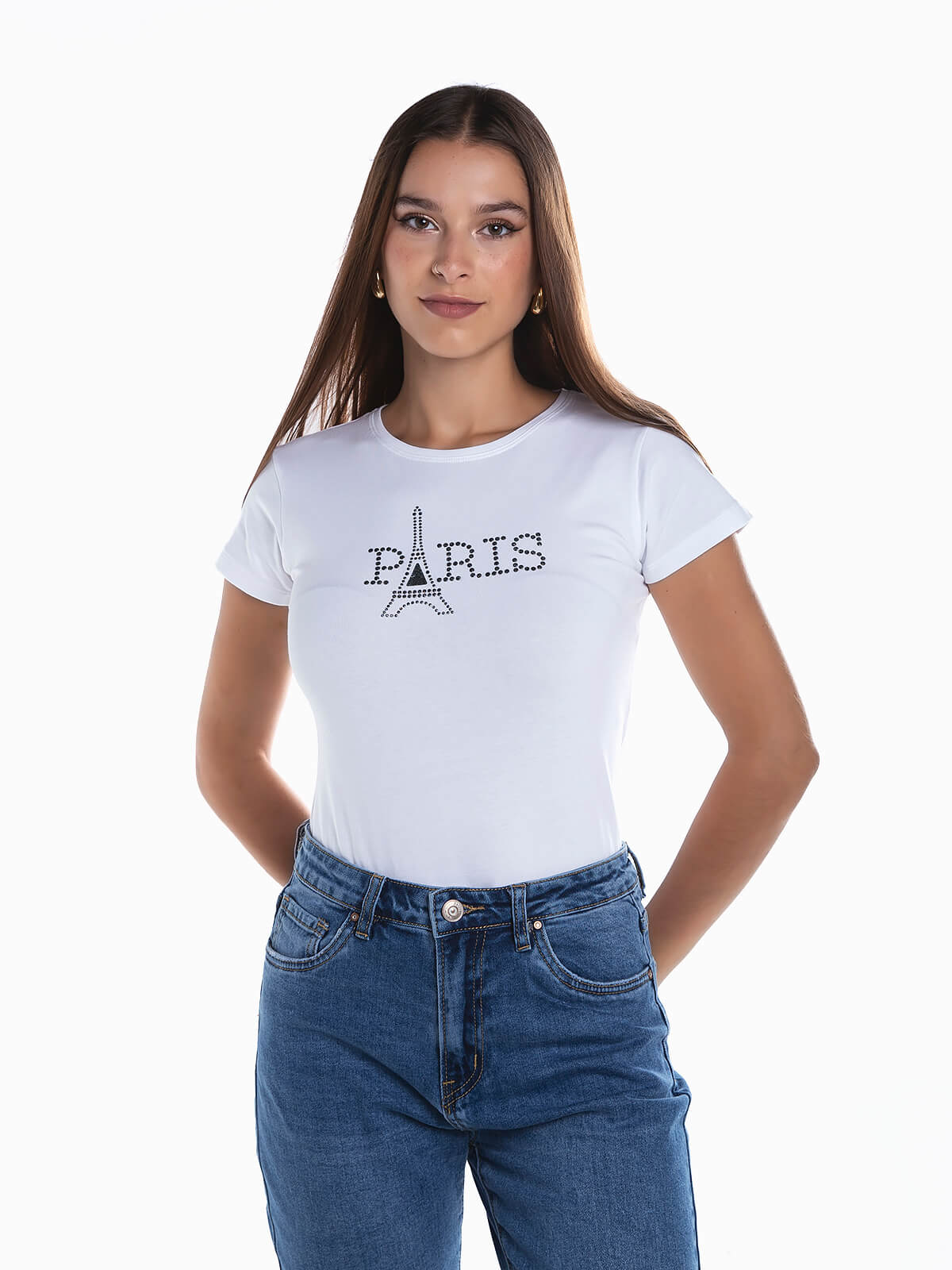 T-shirt de manga curta com letras brilhantes no peito. T-shirt em tecido algodão com decote redondo.
