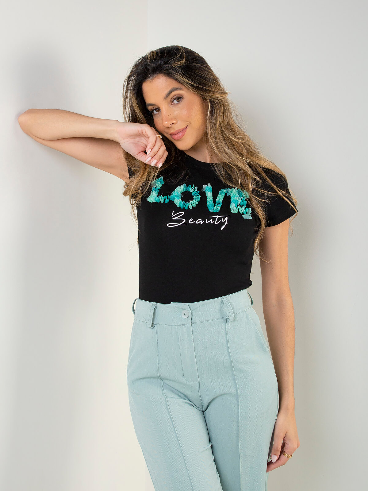 T-shirt de manga curta com aplicação de letras em tule na parte frontal, criando um efeito leve e texturizado. Modelo com decote redondo e corte confortável, ideal para looks casuais com um detalhe diferenciador.