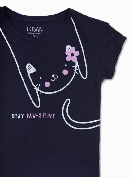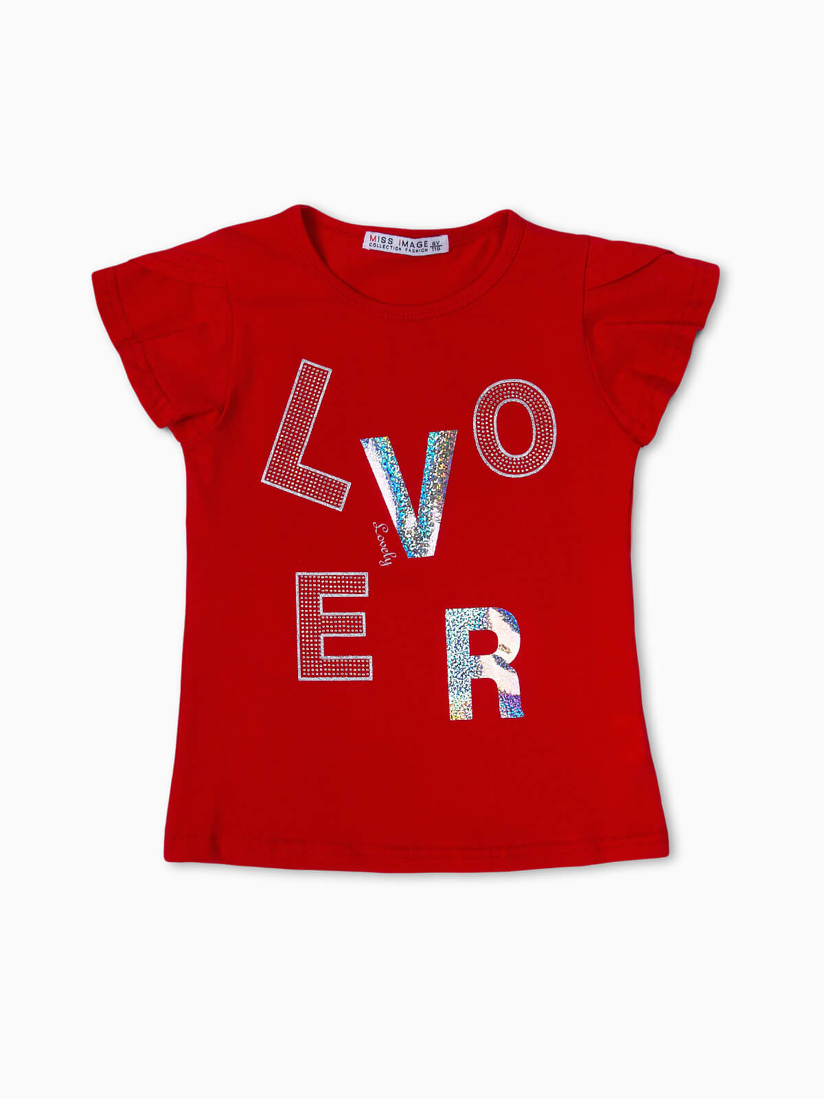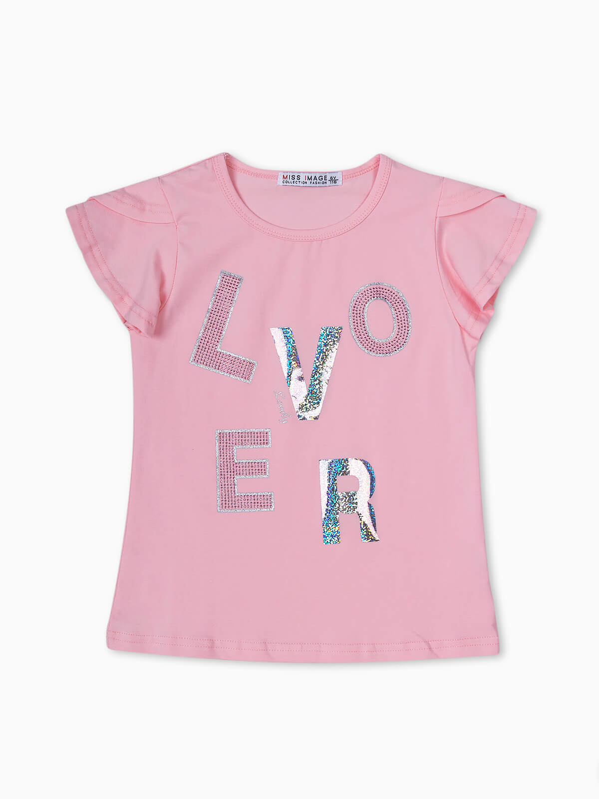 T-shirt de manga curta com estampado ‘Lover’ em brilhantes. T-shirt para menina com decote redondo. Pormenor de folho na manga.