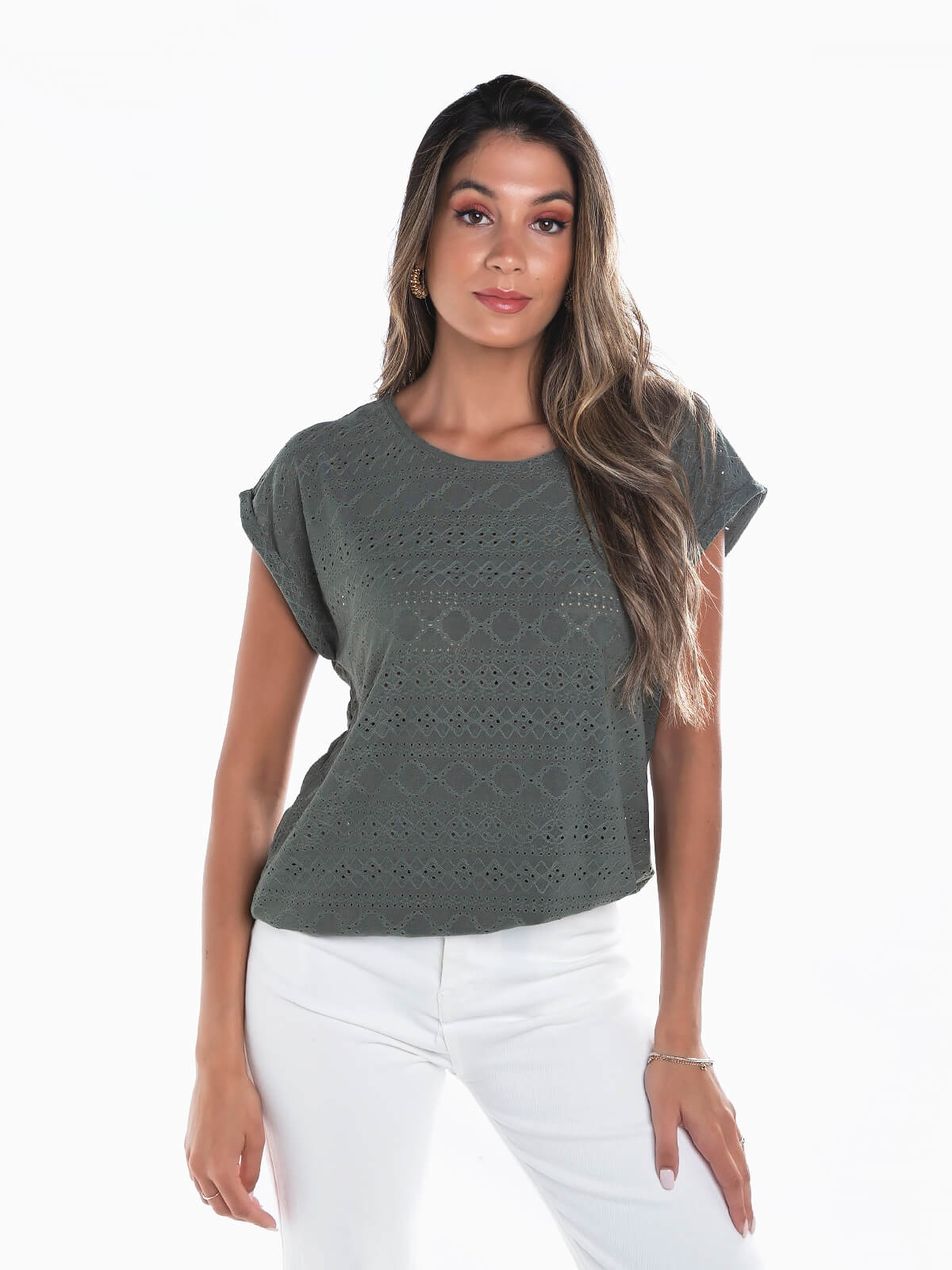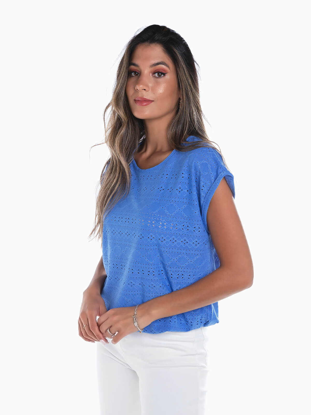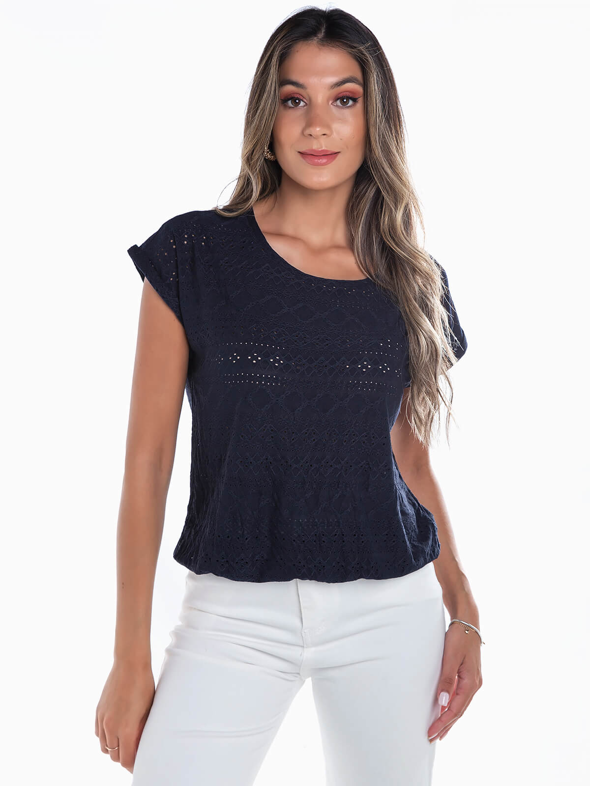 T-shirt de manga curta em malha perfurada com relevo. T-shirt para senhora com decote redondo.