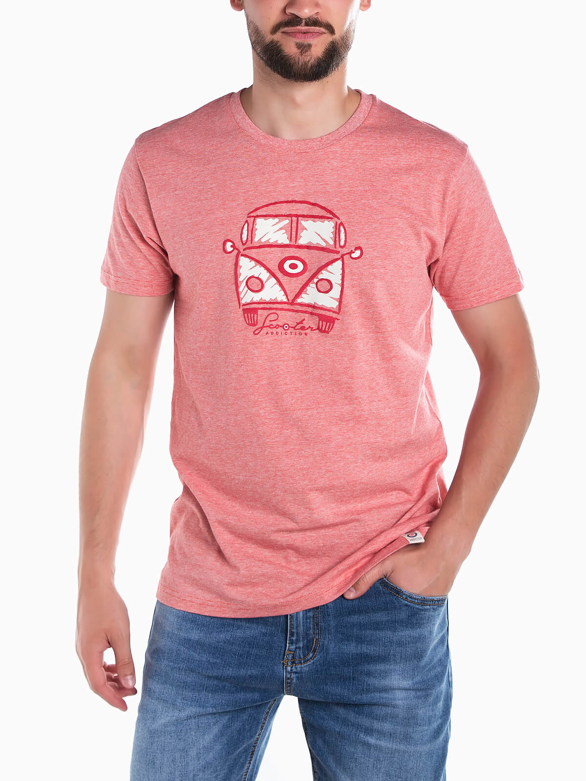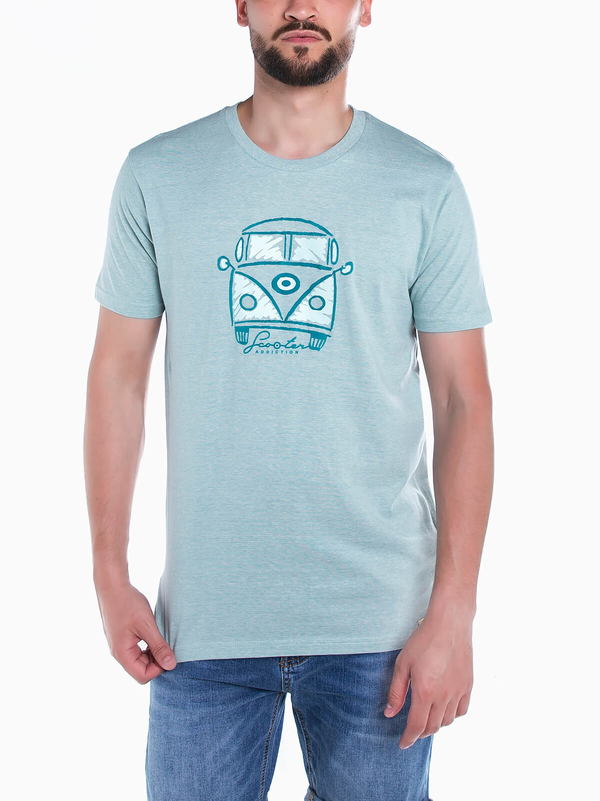 T-shirt de manga curta mesclada com estampado de van no peito. T-shirt em algodão orgânico com gola redonda.