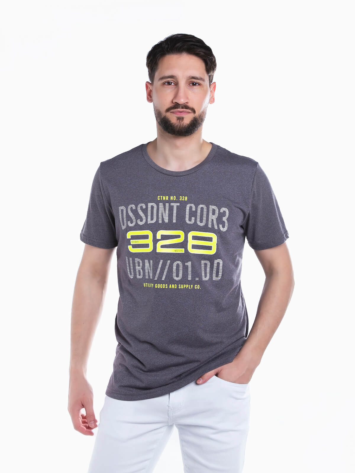 T-shirt de manga curta mesclada para homem. T-shirt com gola redonda e estampado em relevo.