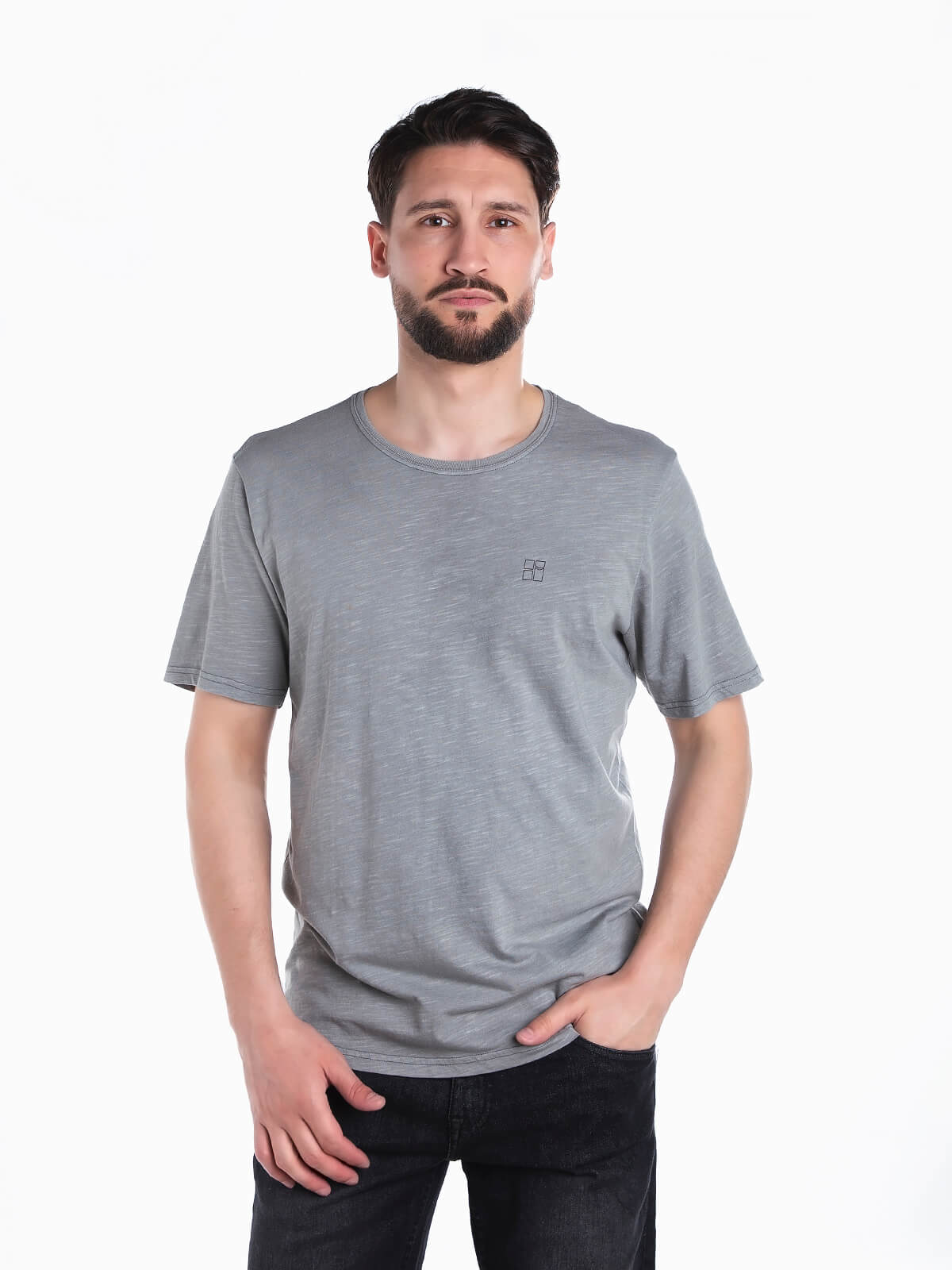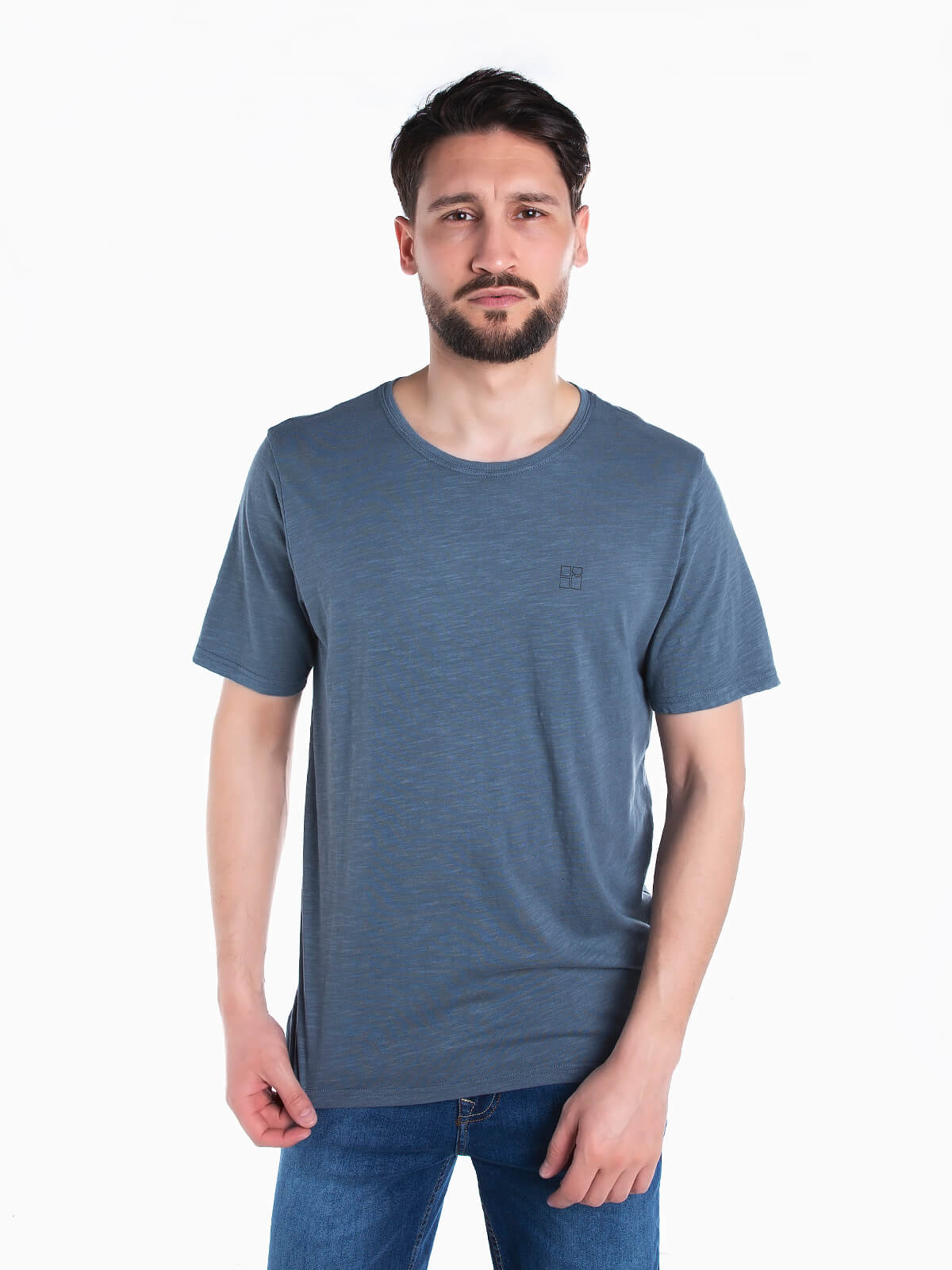 T-shirt de manga curta mesclada para homem. T-shirt em tecido 100% algodão com símbolo estampado no peito. Gola redonda.