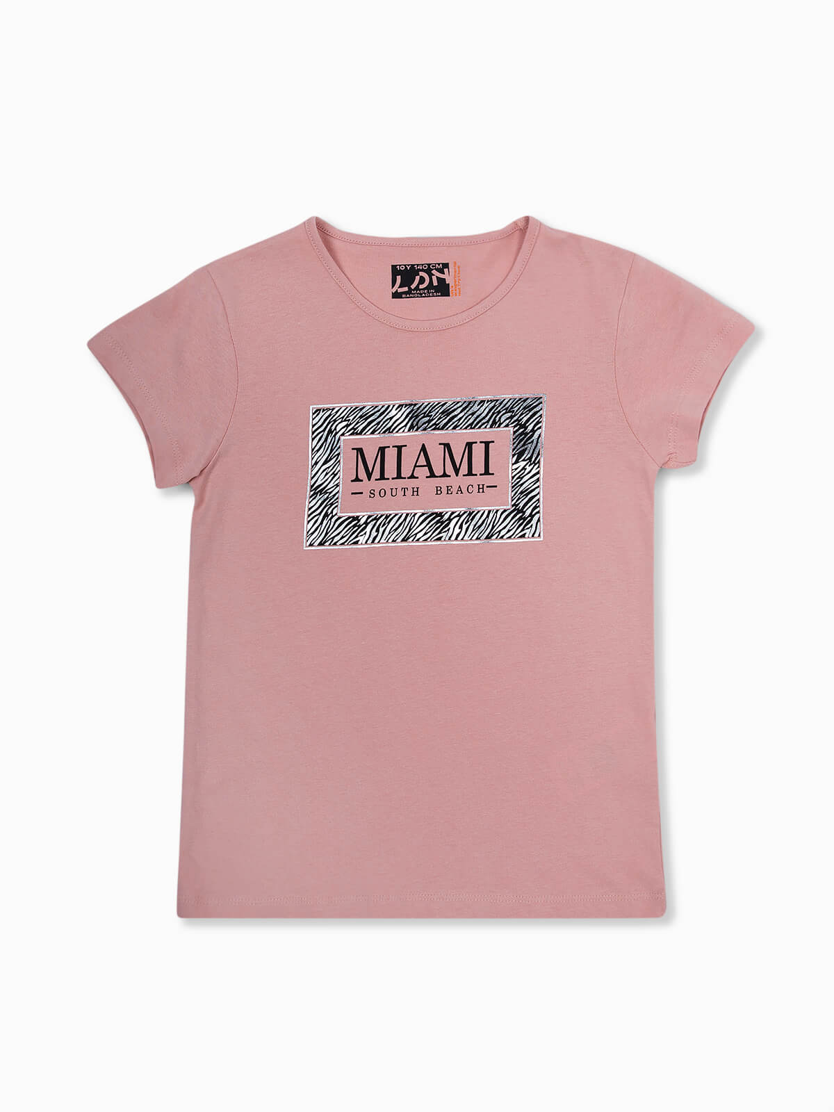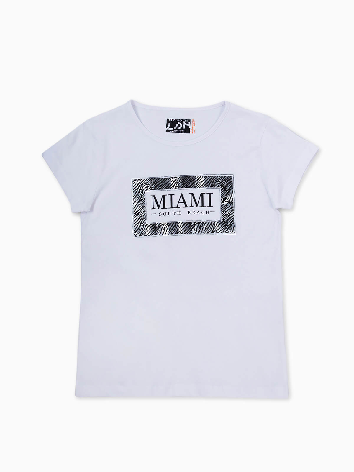 T-shirt de manga curta com animal print e ‘Miami’ no peito. T-shirt para menina com decote redondo.