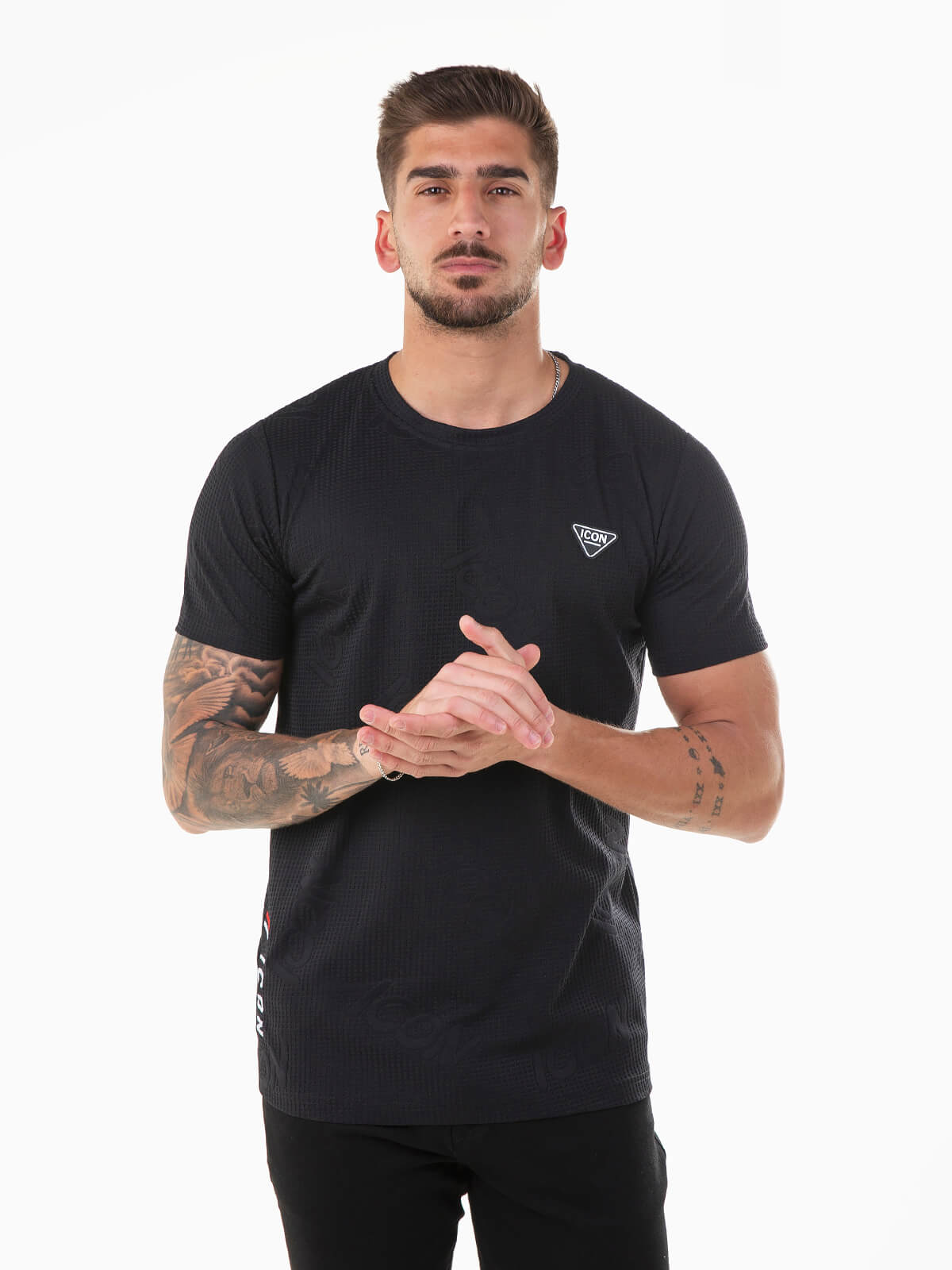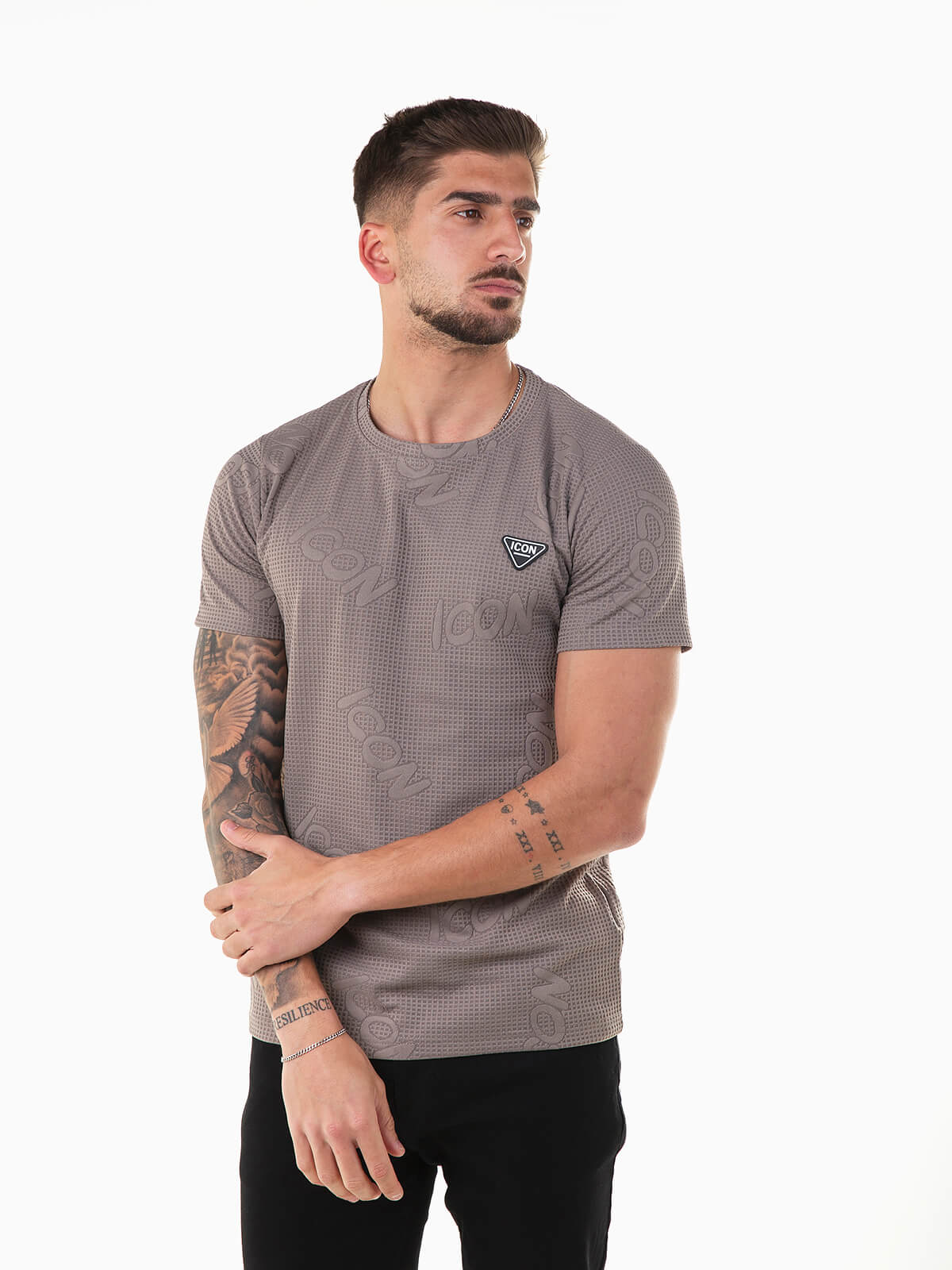 T-shirt de manga curta texturizada com símbolo no peito. T-shirt para homem com gola redonda.