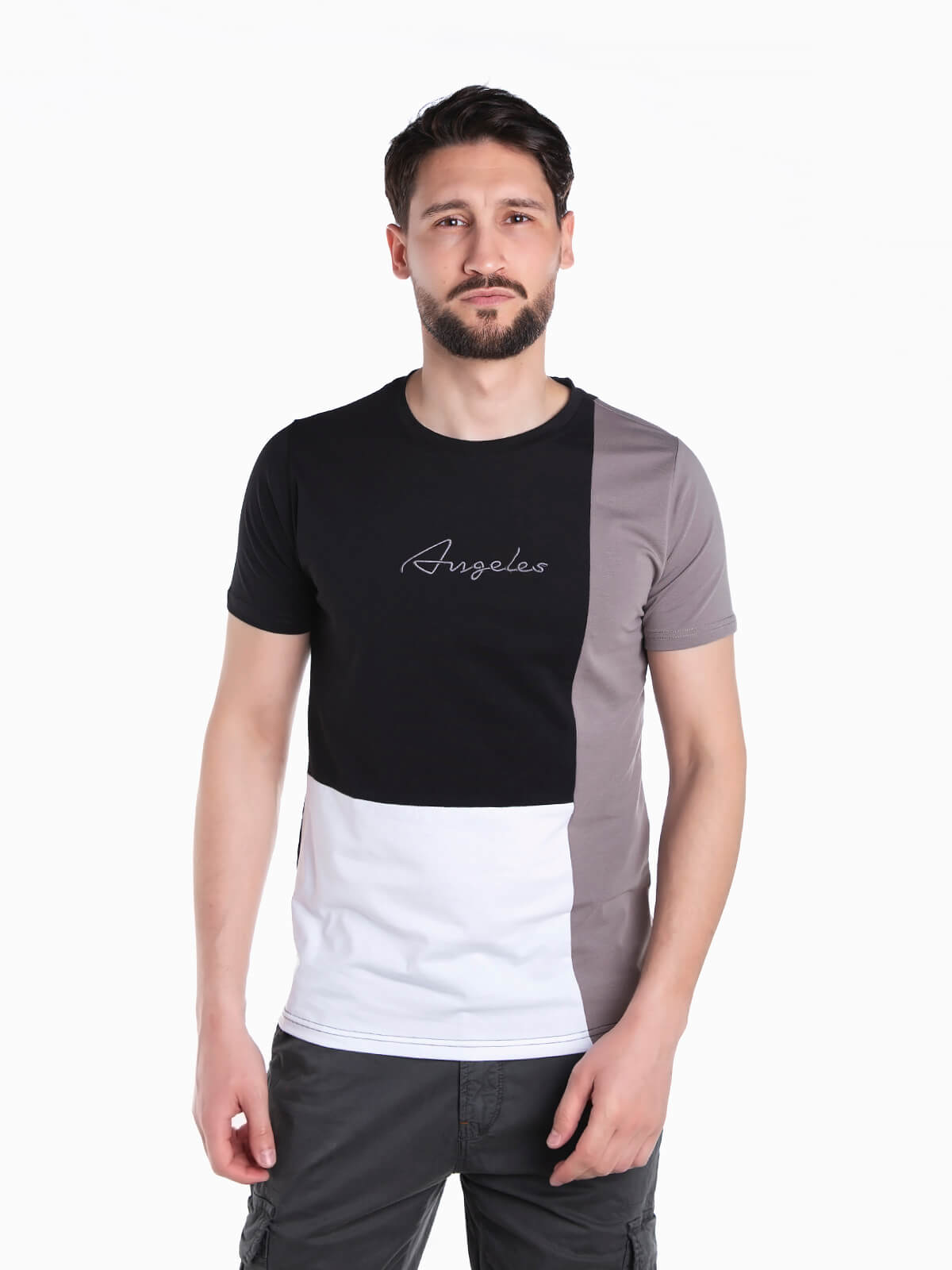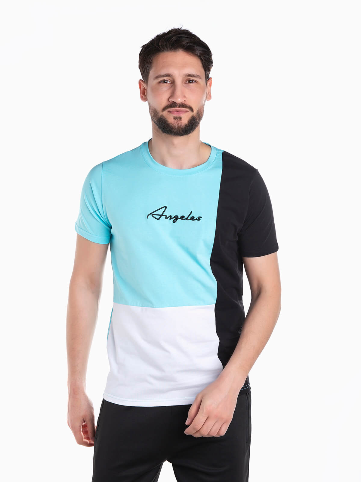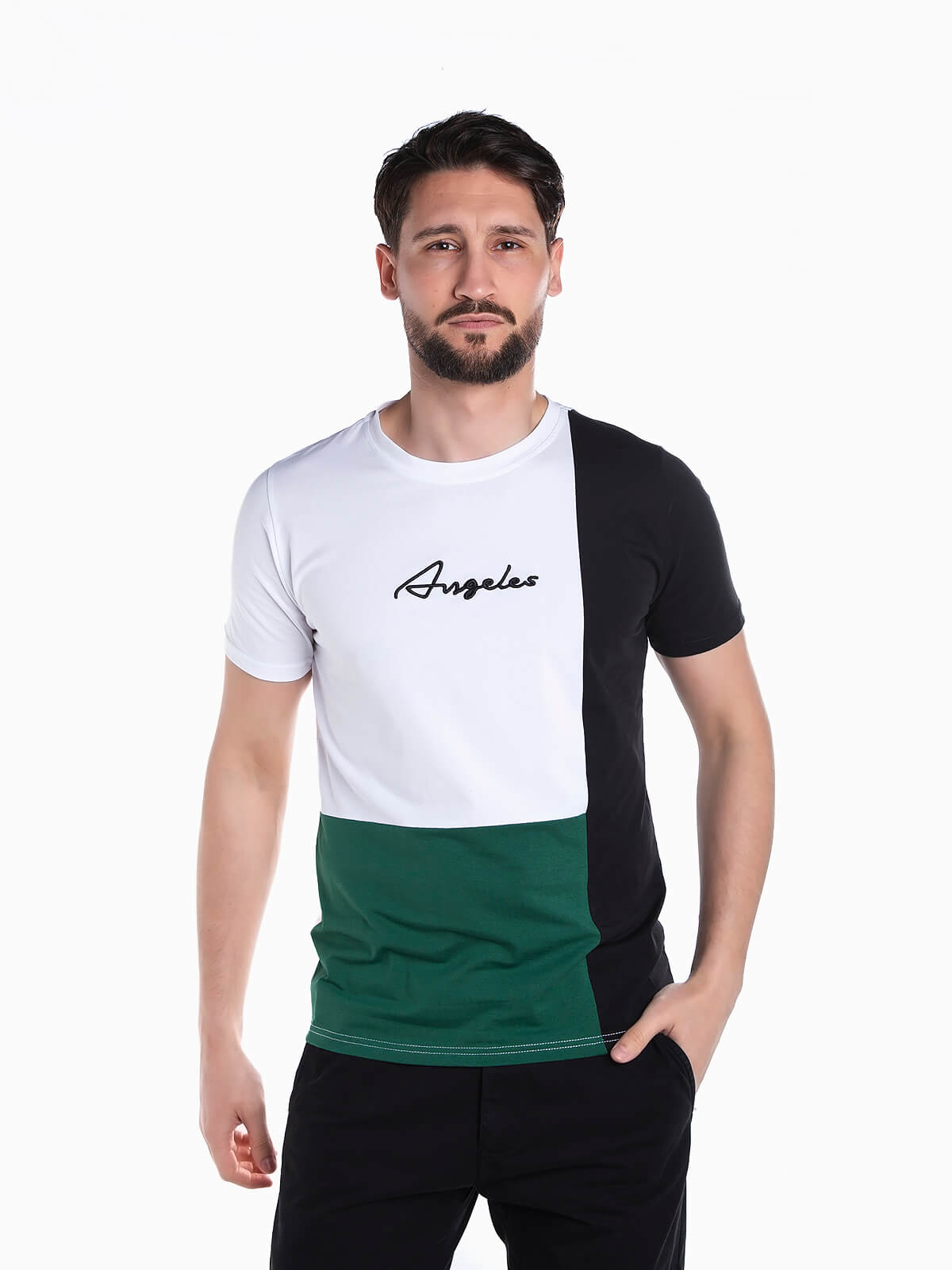 T-shirt de manga curta tricolor com letras bordadas no peito. T-shirt com gola redonda.