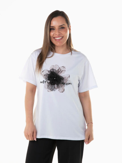 T-shirt menina estampada frase e flores. T-shirt manga curta em algodão. Gola redonda.
