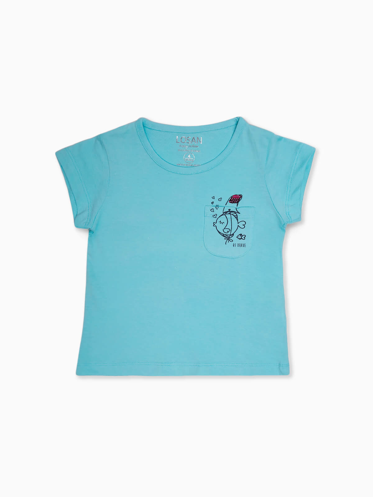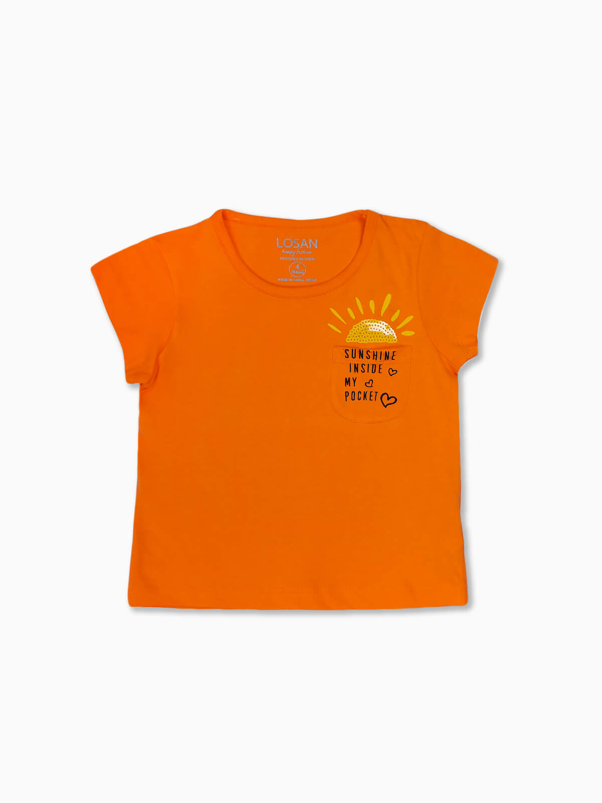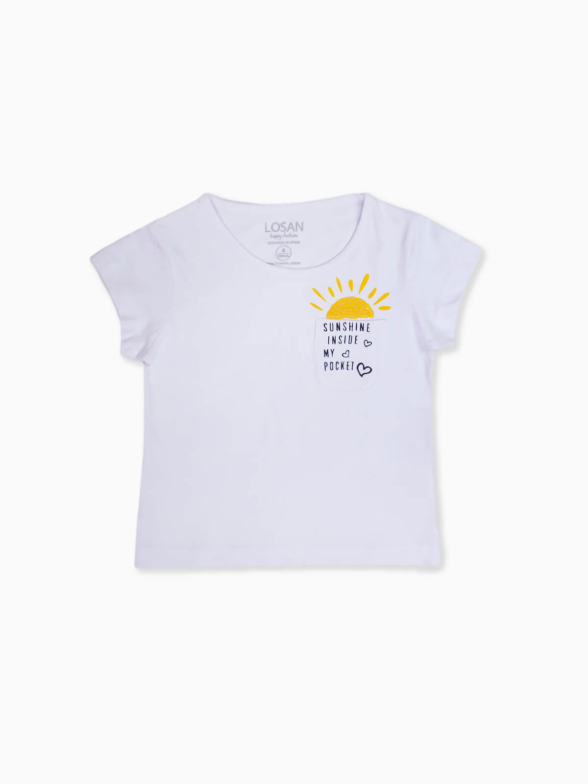 T-shirt de menina com estampados no bolso. T-shirt de manga curta gola redonda.