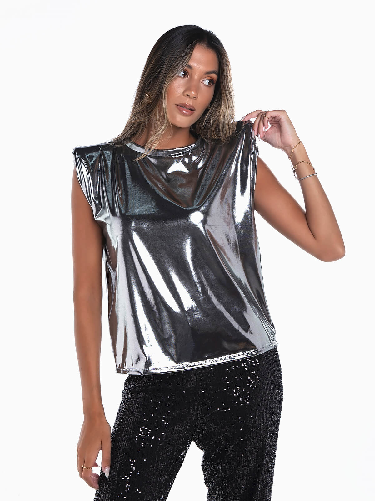 T-shirt metalizada com ombreiras para senhora. T-shirt manga cava com decote redondo.