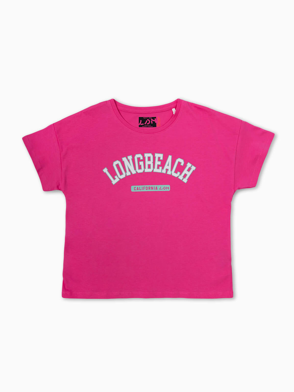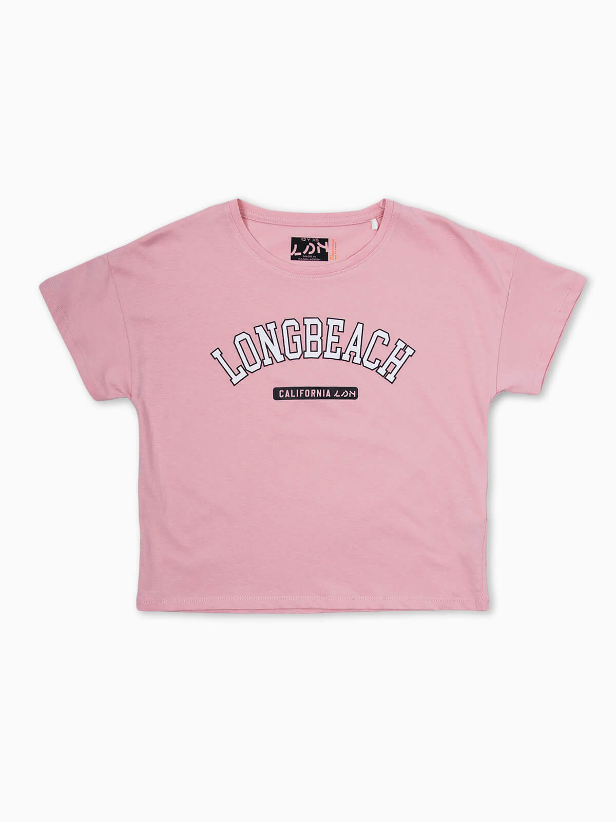 T-shirt oversize de manga curta com estampado de letras no peito. T-shirt para menina em tecido 100% algodão com decote redondo.