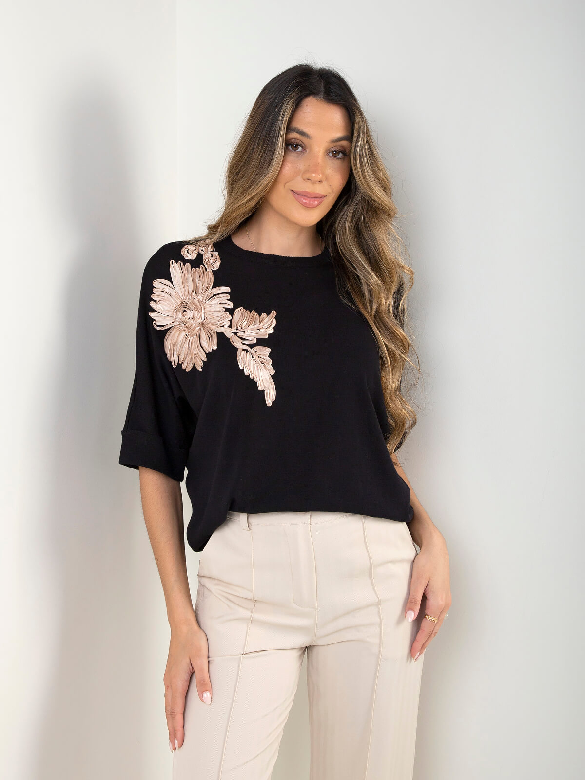 T-shirt oversized com aplicação floral em relevo na parte frontal, que acrescenta textura e destaque à peça. Modelo de manga curta com corte amplo e confortável, ideal para looks descontraídos com um toque feminino.
