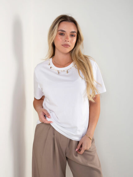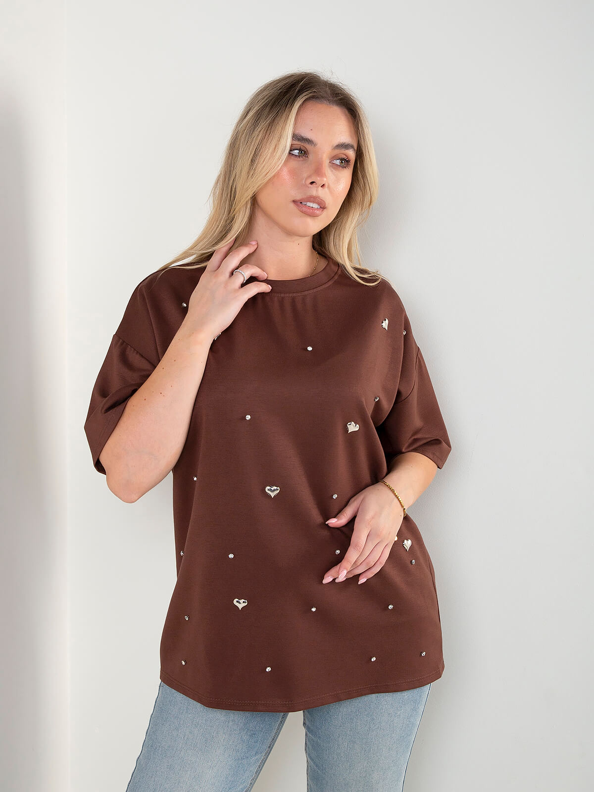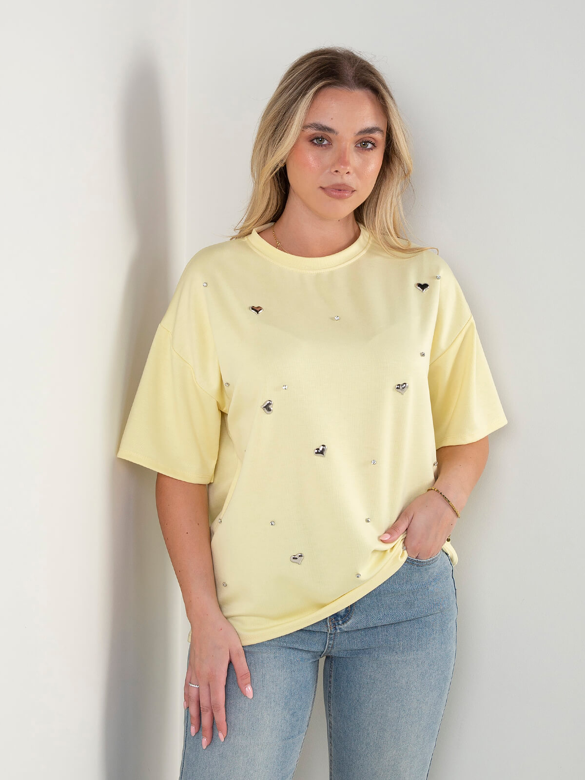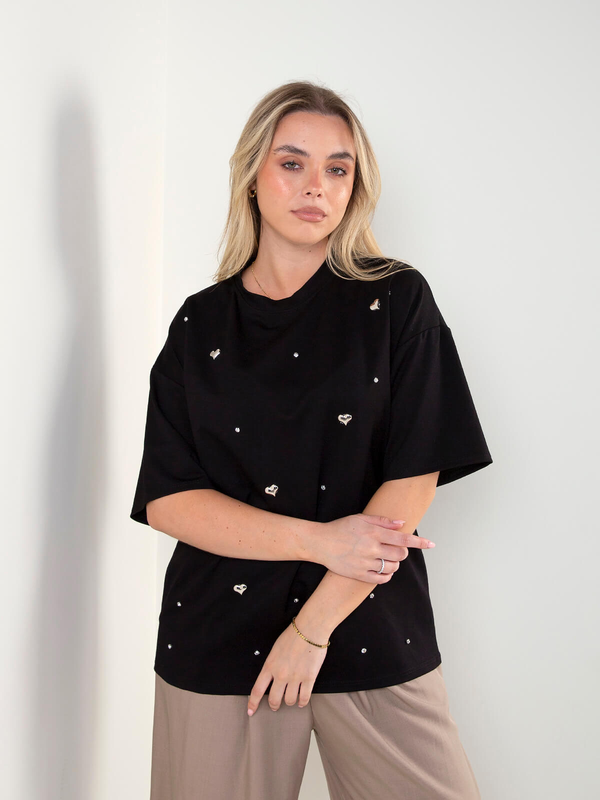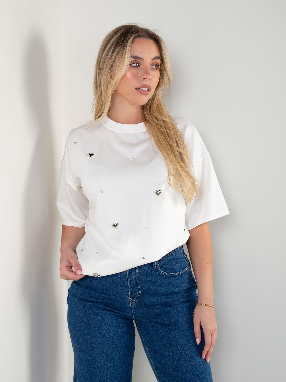 T-shirt de manga curta com corte oversized, ideal para um look descontraído. Modelo de decote redondo com aplicação de pequenos brilhos e corações metálicos, que acrescentam um detalhe diferenciador. Confortável e fácil de conjugar no dia a dia.