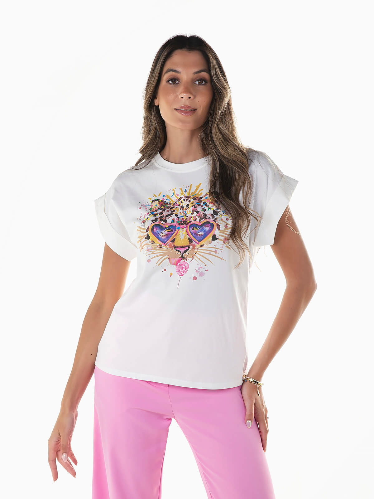 T-shirt pérola com estampado animal para senhora. T-shirt com mini manga e dobra. Decote redondo.