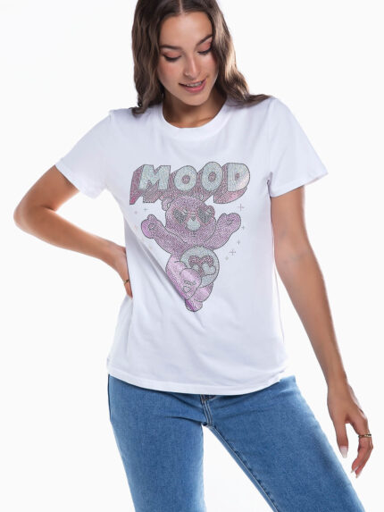 T-shirt pérola com encaixe de folhos em ganga e flores bordadas. T-shirt manga cava para senhora com decote redondo.