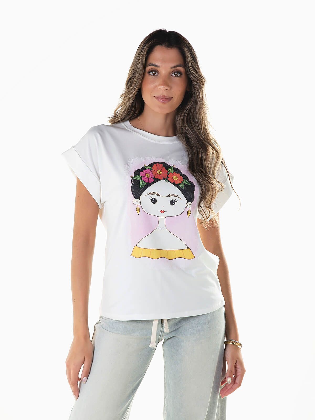T-shirt de manga curta com estampado no peito a contrastar. T-shirt com decote redondo e pormenor de dobra na manga.