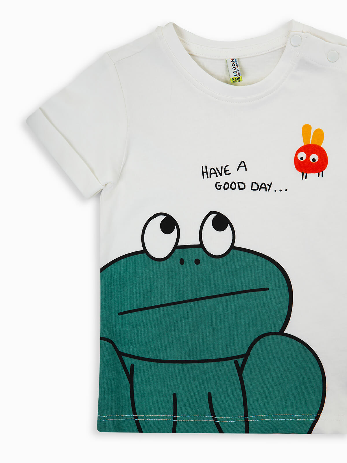 T-shirt pérola com estampado sapo para bebé menino. T-shirt manga curta com gola redonda e aperto de dois botões pressão.