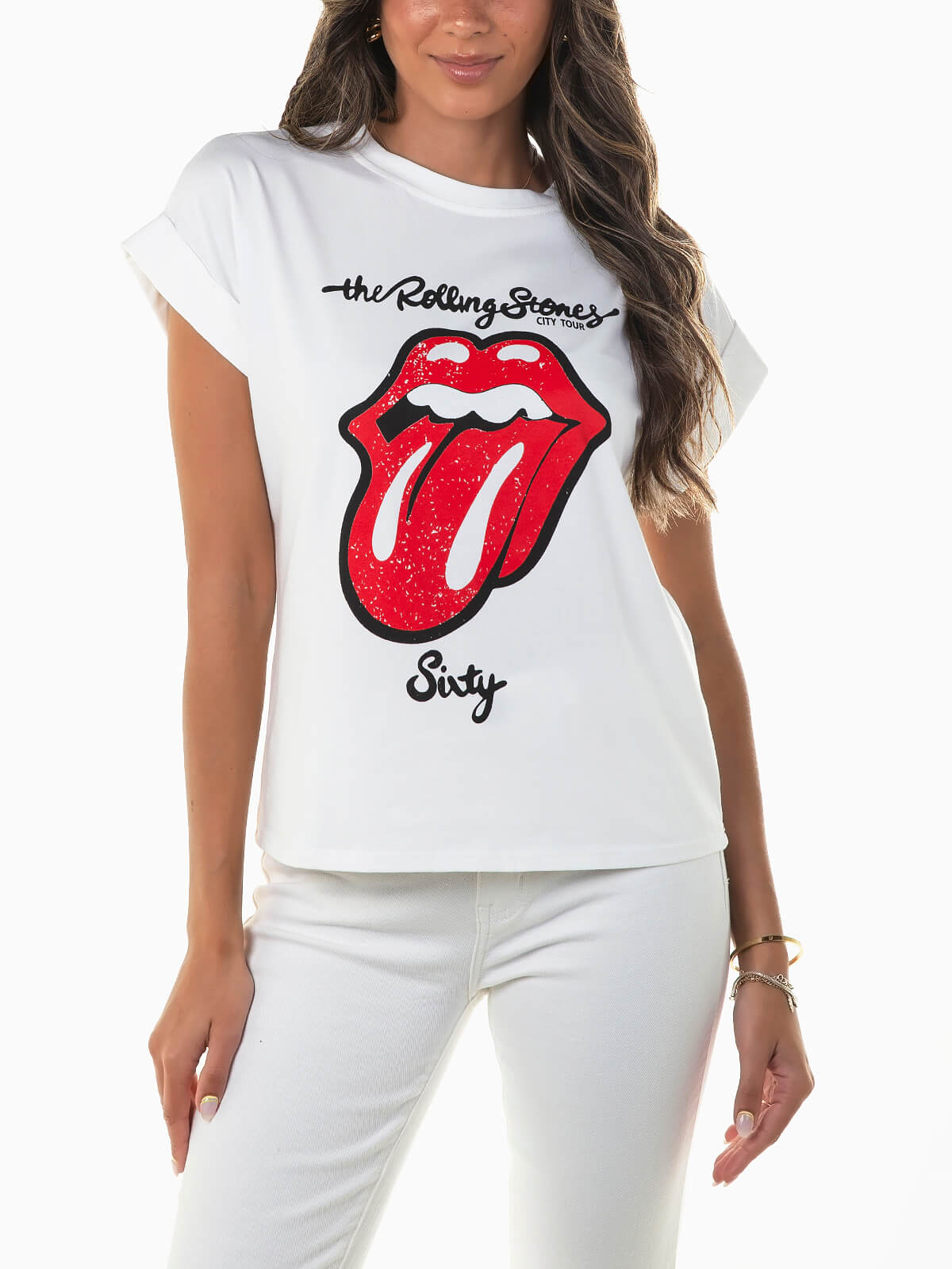 T-shirt pérola manga curta com estampado no peito alusivo a banda de rock. T-shirt para senhora com decote redondo.