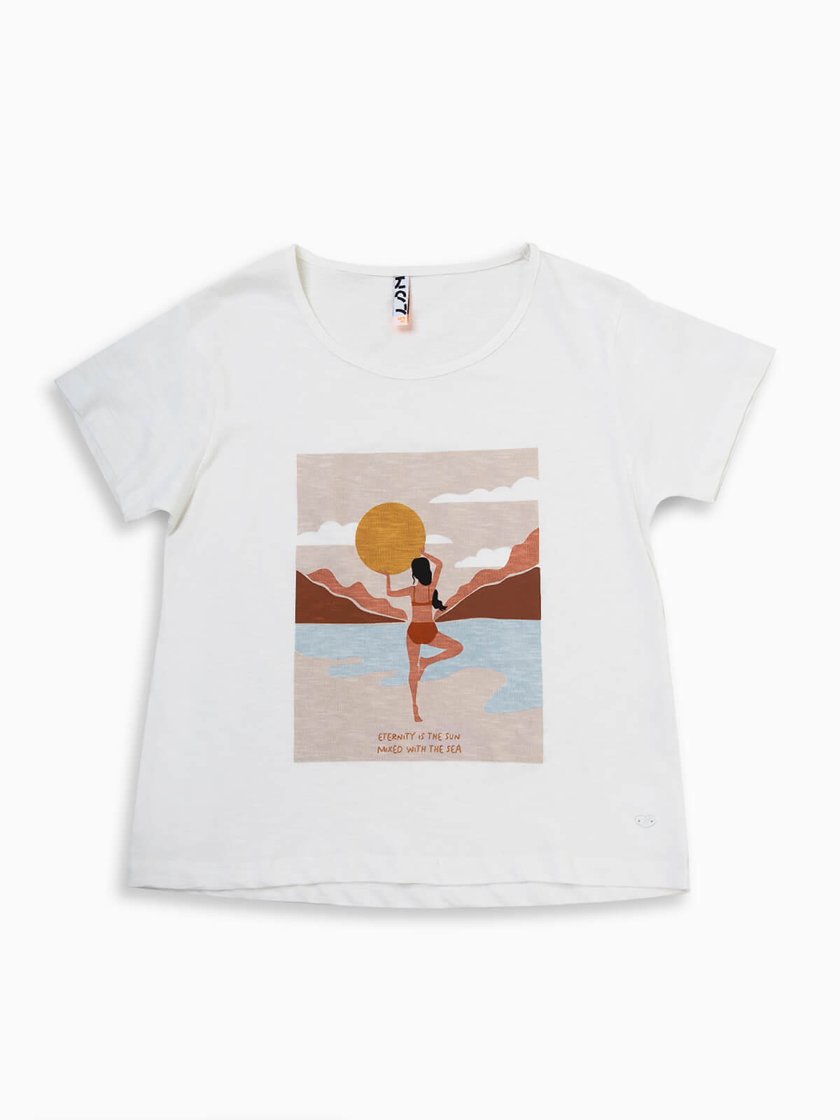 T-shirt pérola com imagem estampada. T-shirt manga curta para menina com decote redondo.