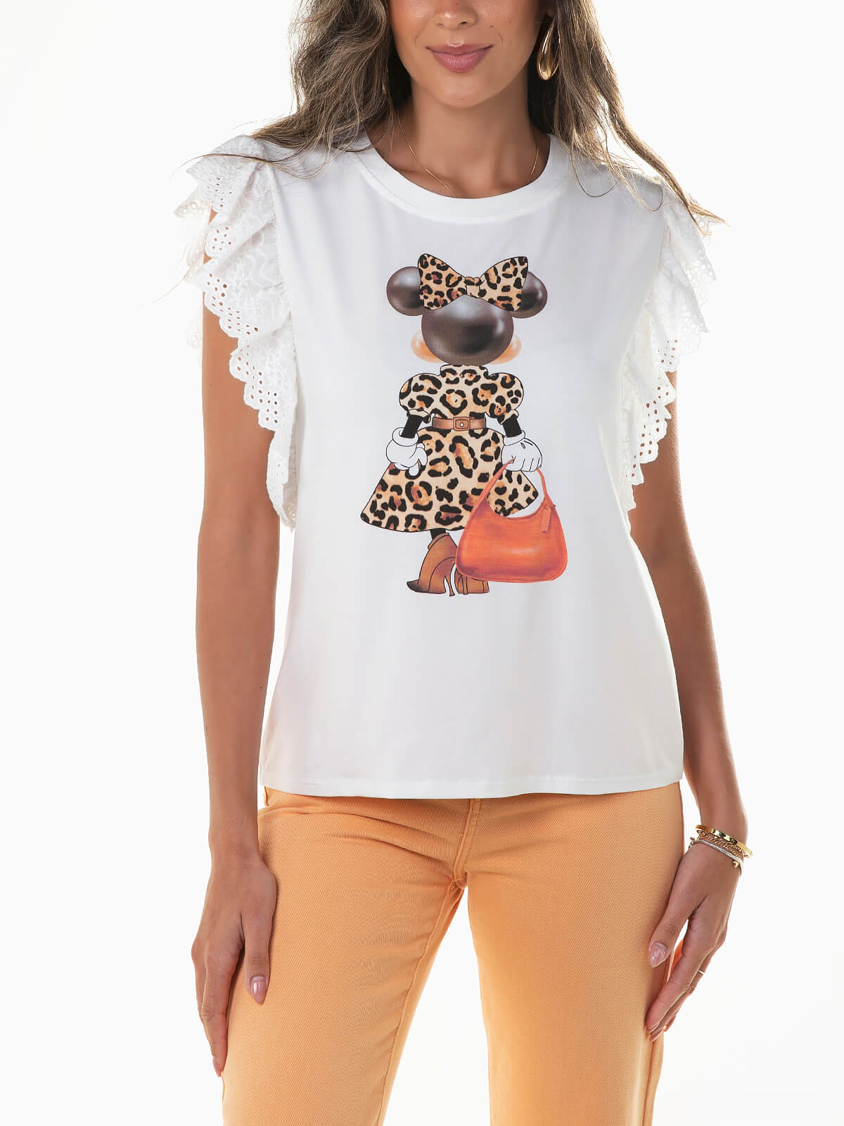 T-shirt pérola de manga cava com folhos bordado inglês aplicados. T-shirt com estampado animal e decote redondo.