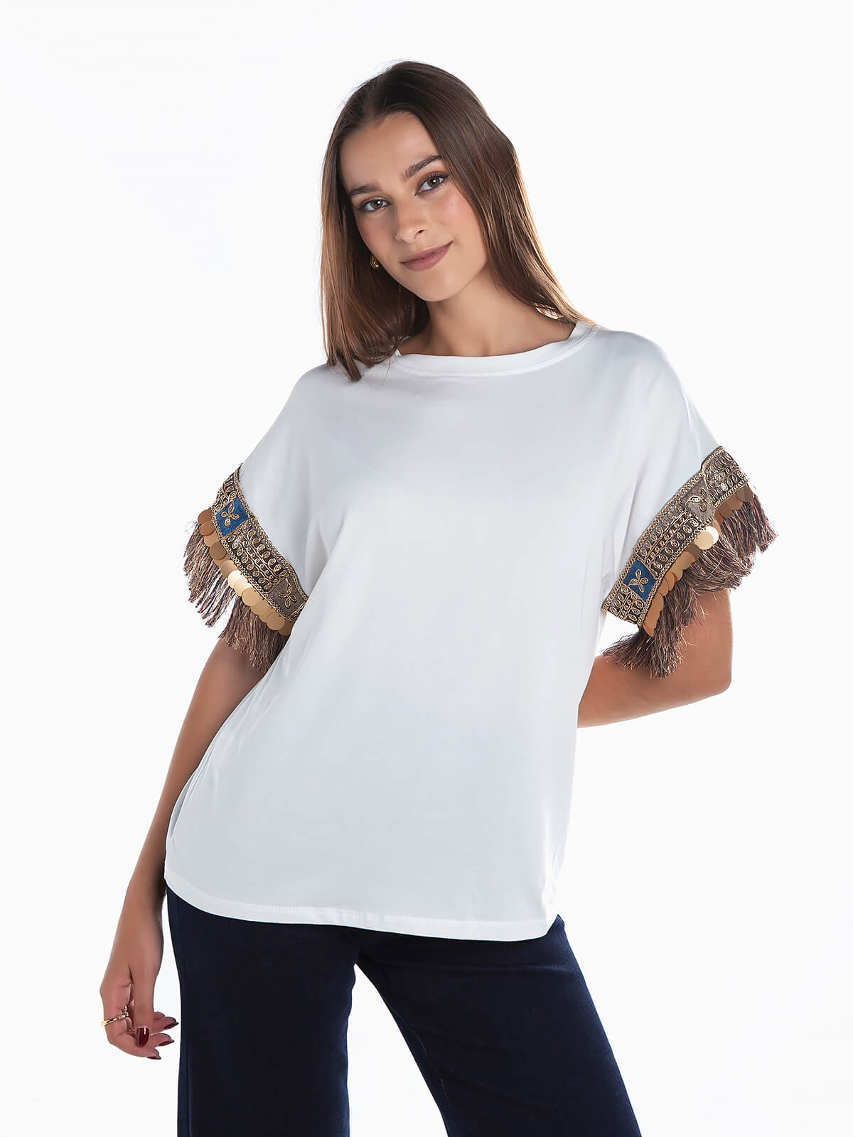 T-shirt pérola de manga curta com franjas e missanjas aplicadas. T-shirt oversize com decote redondo.