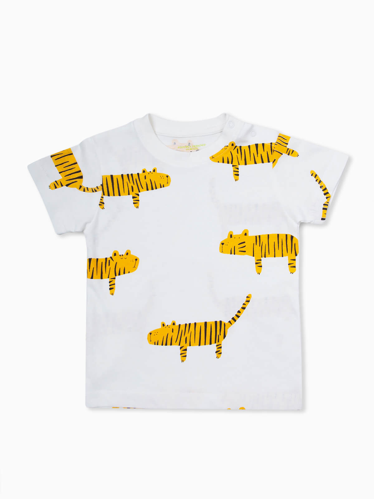 T-shirt pérola de manga curta com estampado de tigres. T-shirt para bebé menino em tecido 100% algodão com decote redondo e aperto de botões pressão.