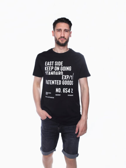 T-shirt preta com bordado contrastante no peito. T-shirt para homem em algodão orgânico para maior conforto e durabilidade. Gola redonda.