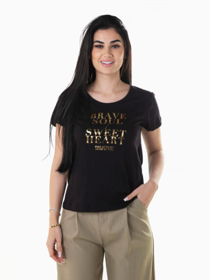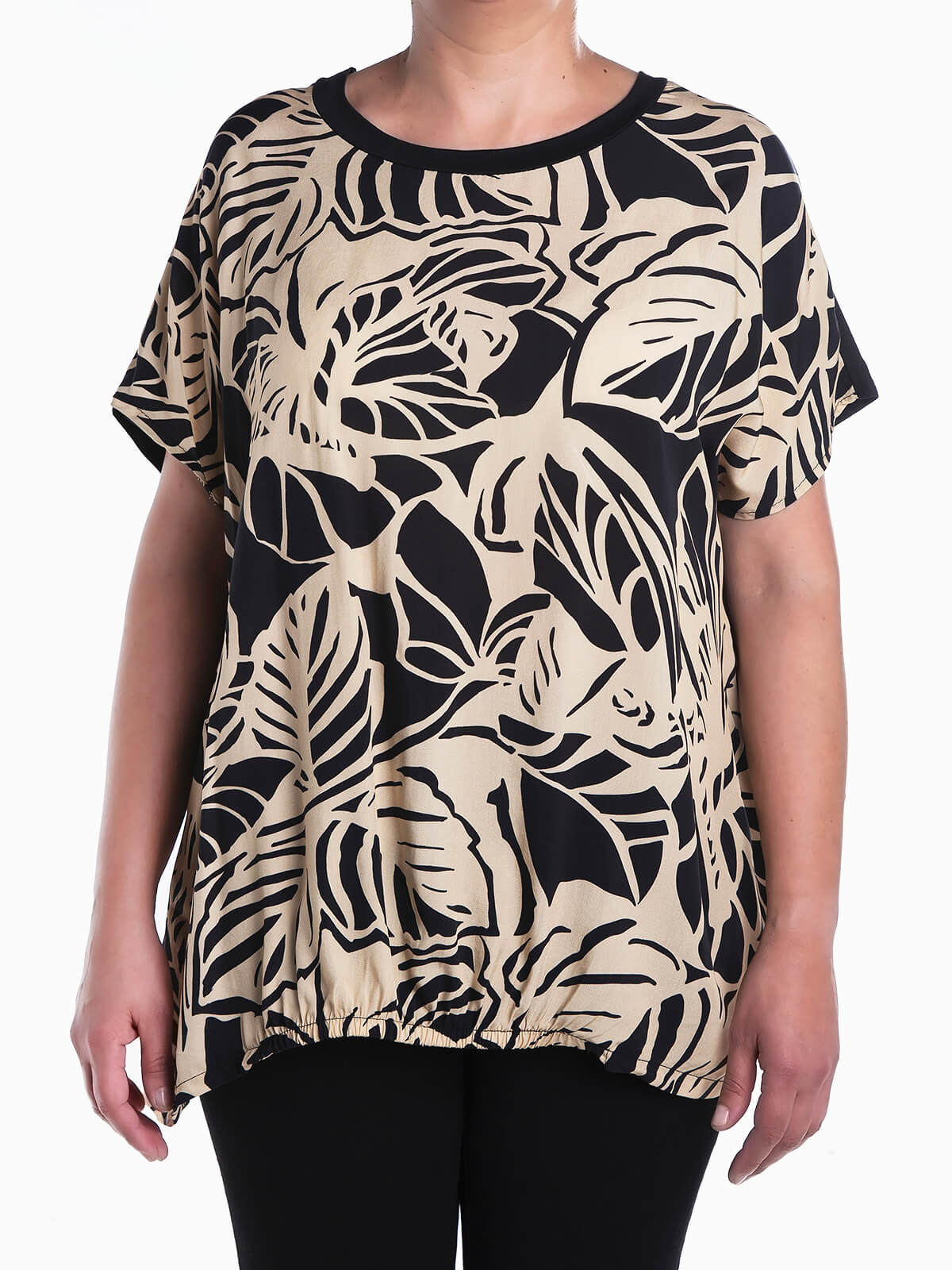 T-shirt preta com folhas em bege para senhora. T-shirt comprida fluída com pormenor elástico na base. Decote redondo.