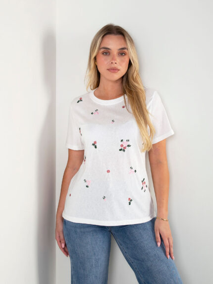 T-shirt preta com aplicação de lantejoulas. Modelo de corte reto, confortável e fácil de conjugar em looks do dia a dia com um toque de brilho.