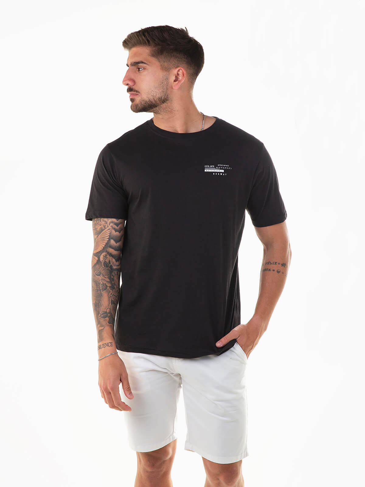 T-shirt preta de manga curta com estampado no peito. T-shirt 100% algodão para homem com gola redonda.