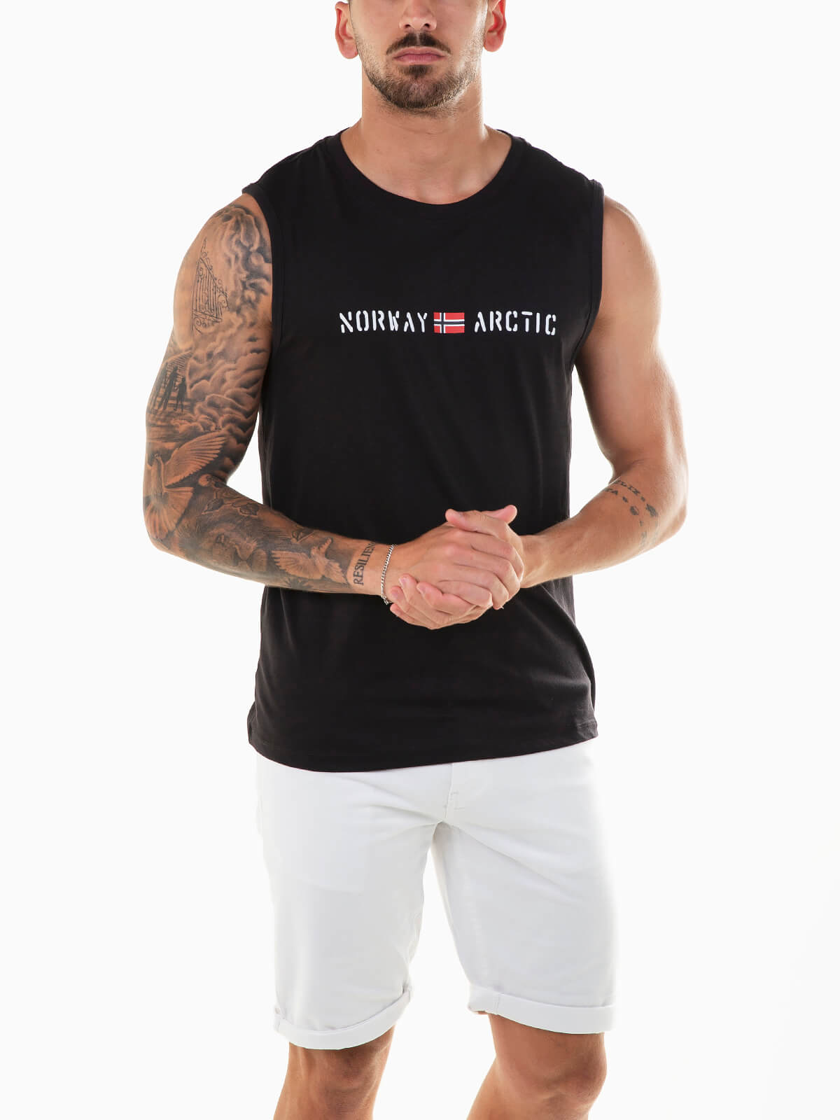 T-shirt preta sem mangas para homem. T-shirt 100% algodão com estampado e gola redonda.