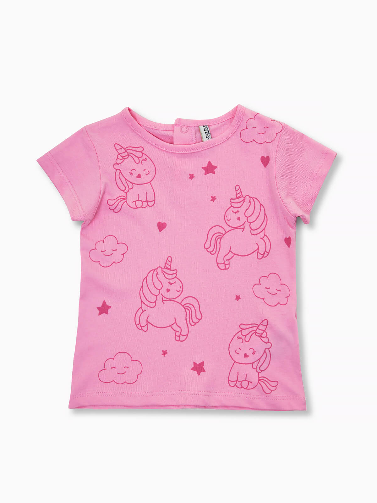 T-shirt rosa de manga curta com unicórnios estampados. T-shirt para bebé menina com decote redondo e aperto posterior de botões mola.
