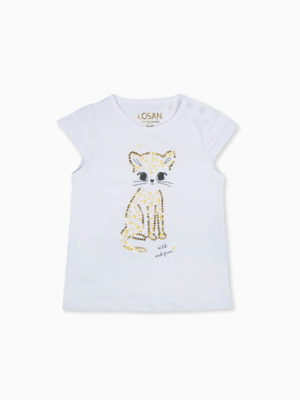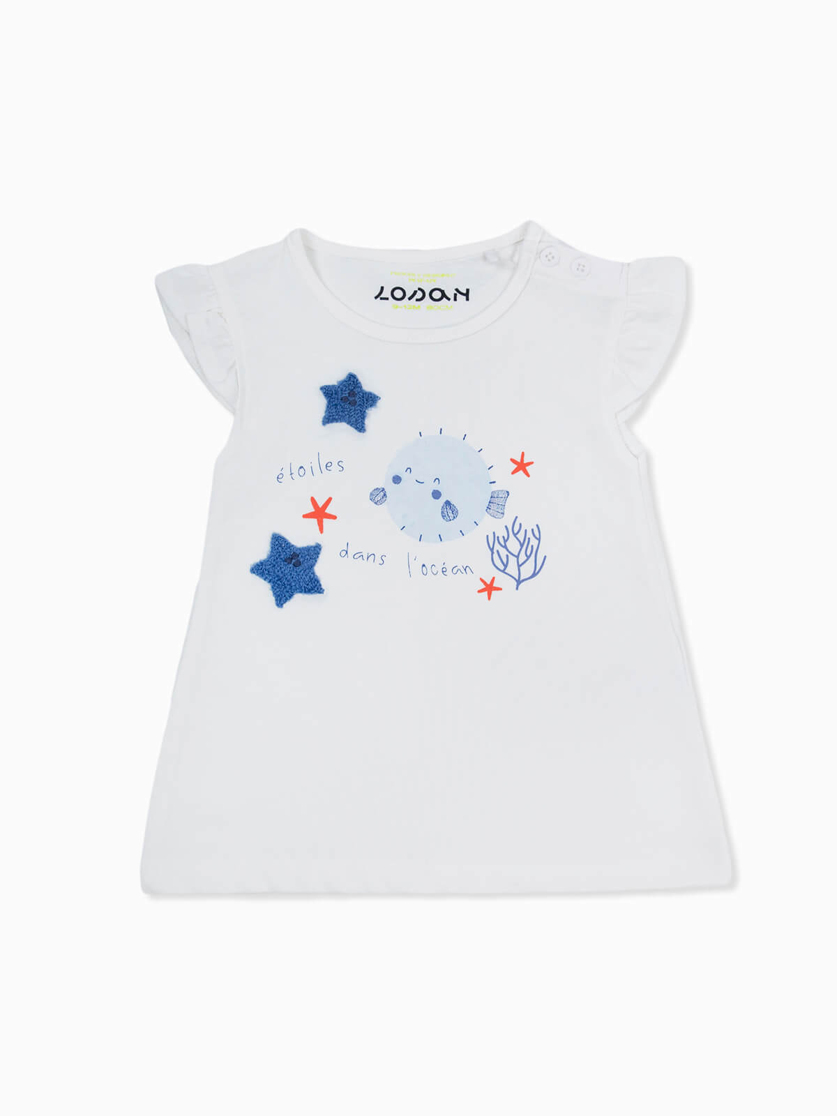 T-shirt sem mangas com bordado de estrelas terrycloth e motivos estampados. T-shirt para bebé menina com folho na cava e decote redondo. Aperto de dois botões.