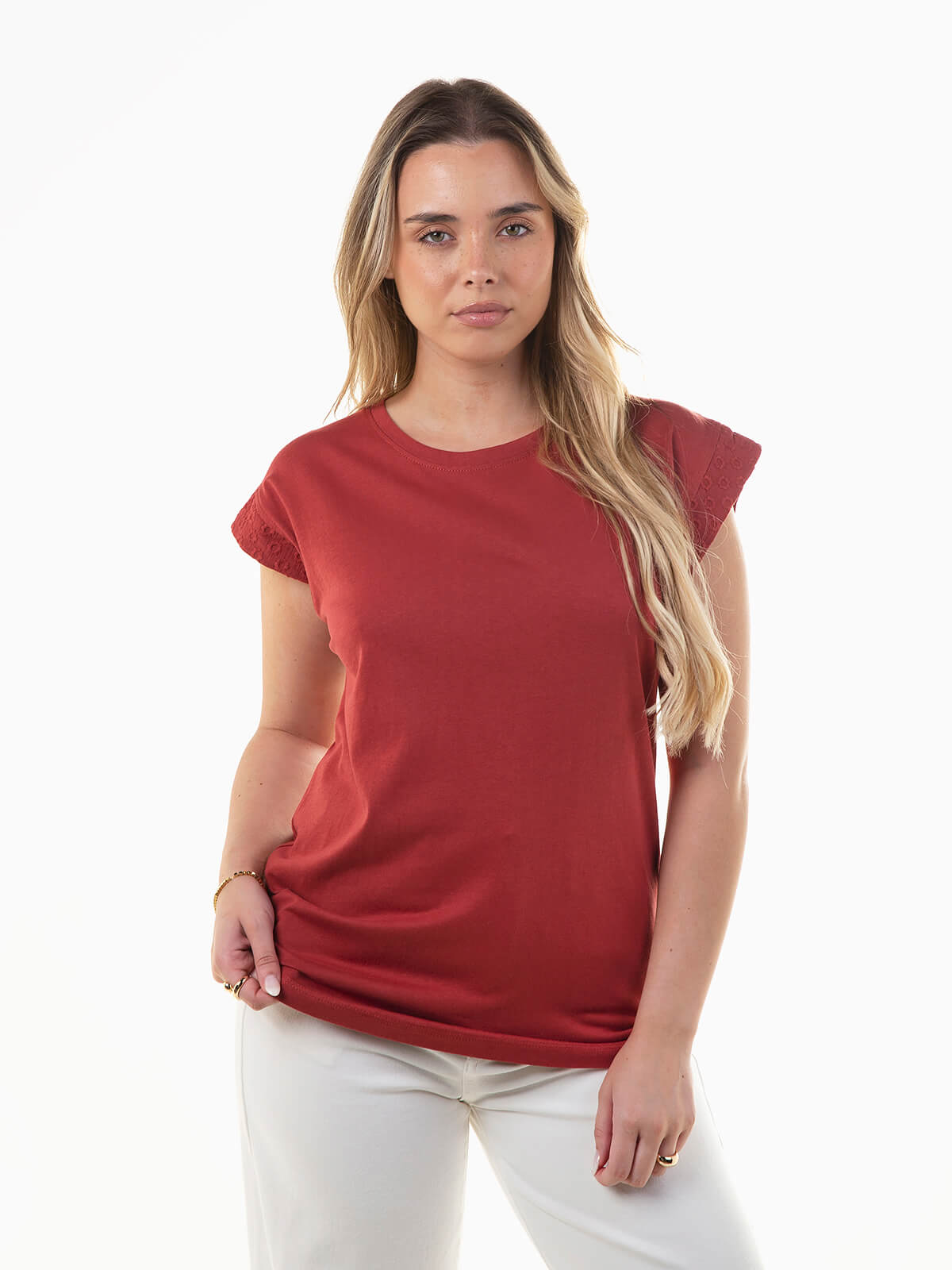 T-shirt sem mangas com pormenores bordados na cava. T-shirt confortável 100% algodão com decote redondo.