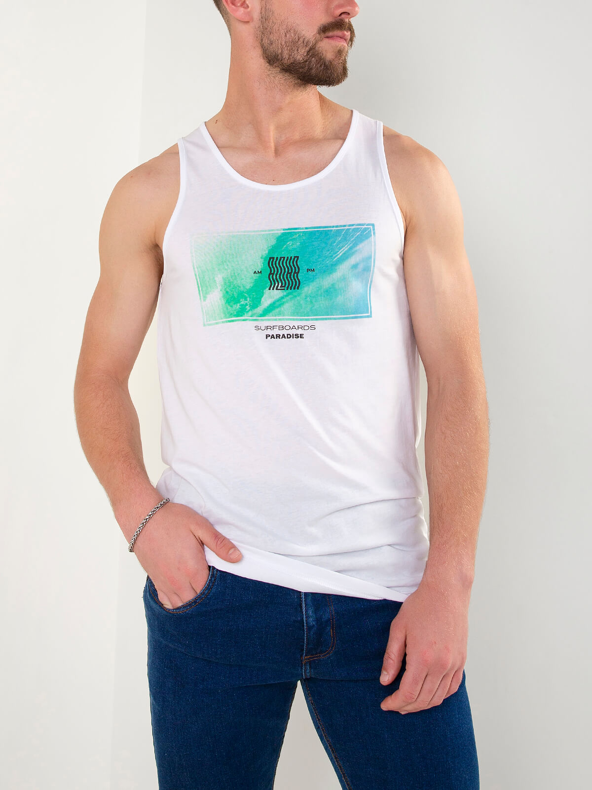 T-shirt sem mangas de homem em tecido leve e confortável, com estampado frontal de inspiração surf. Modelo de corte regular, ideal para dias quentes e looks descontraídos de verão.