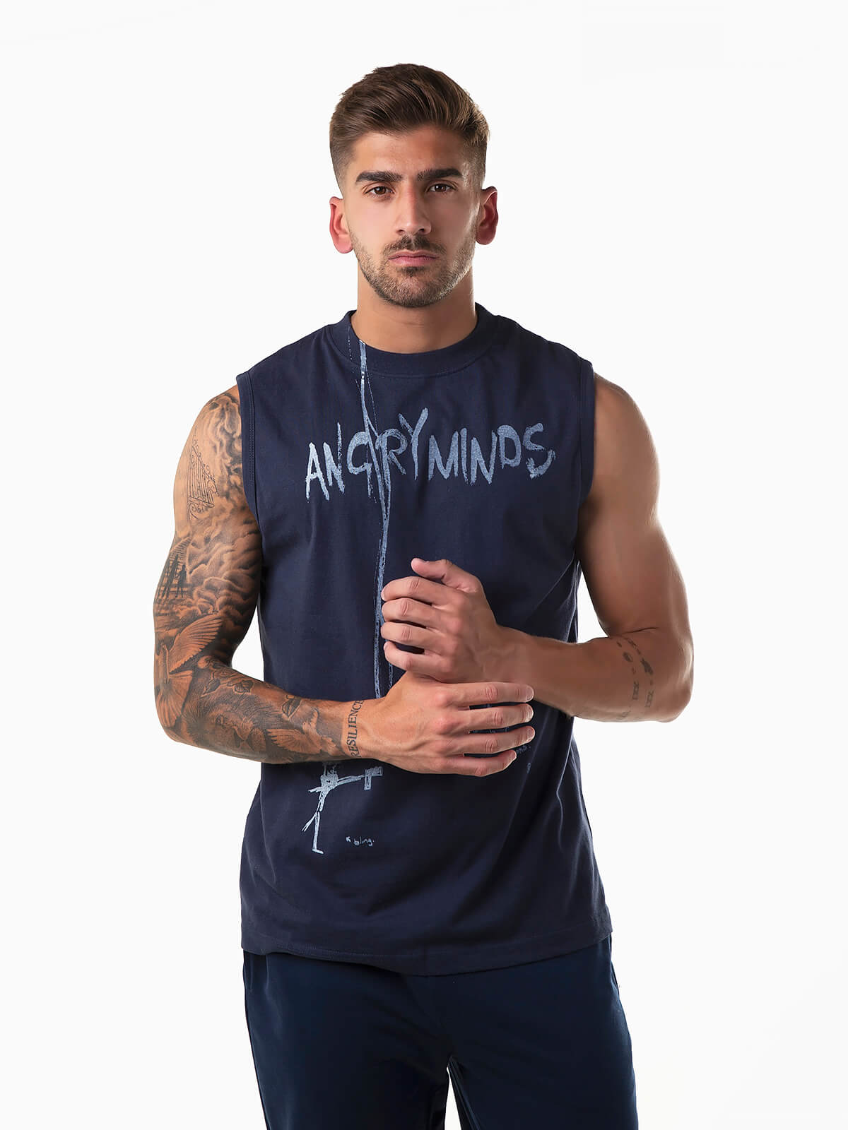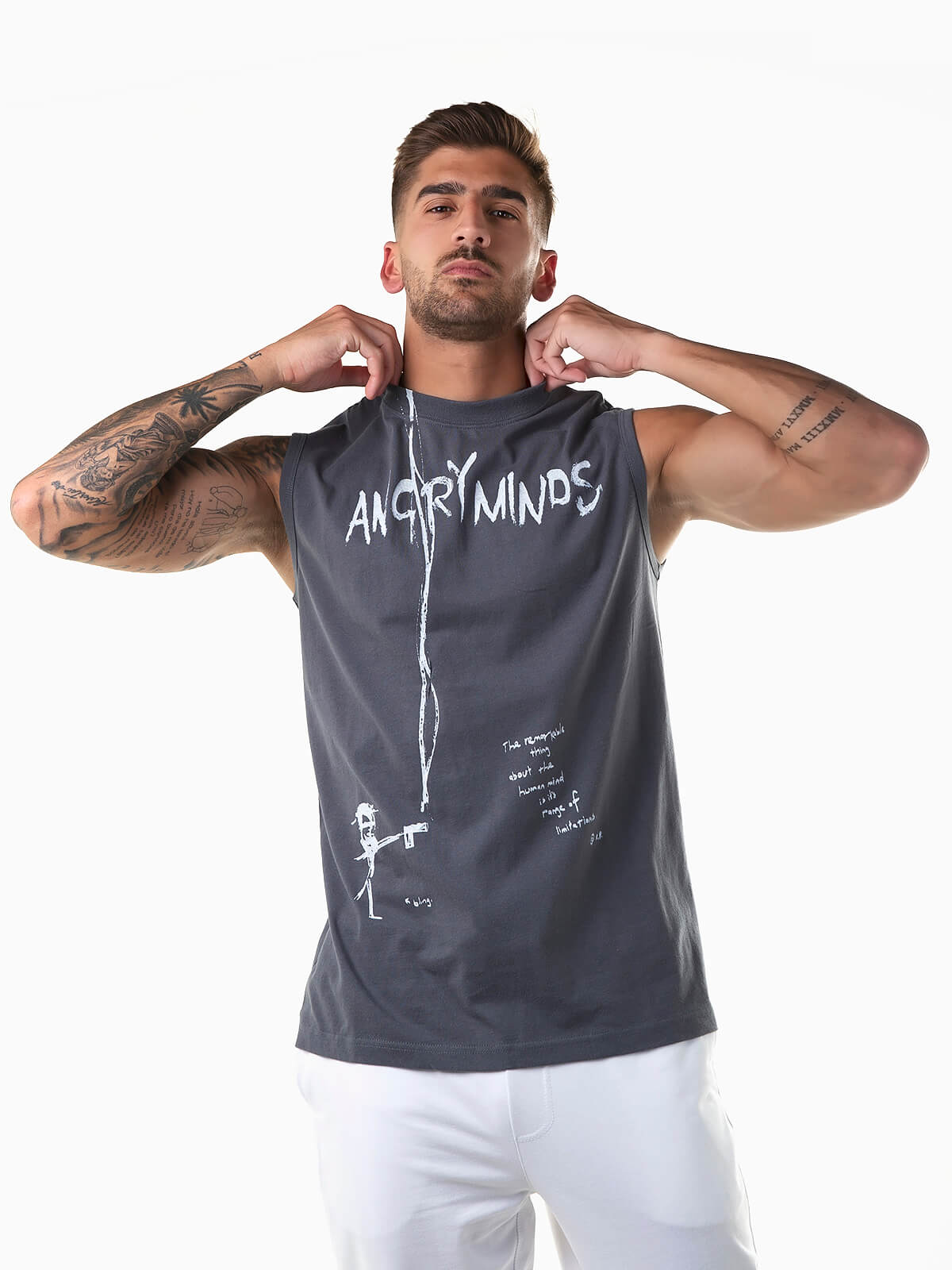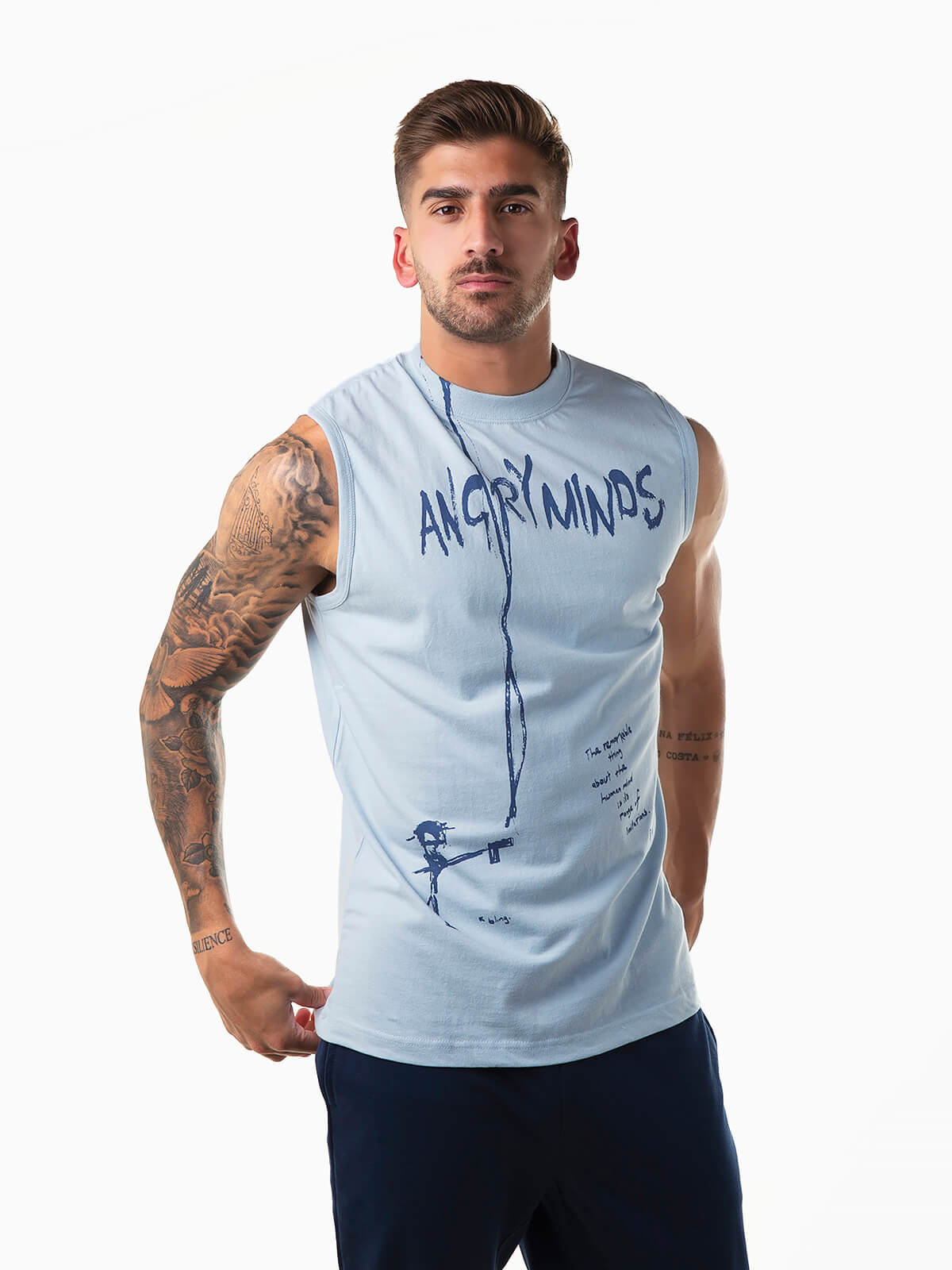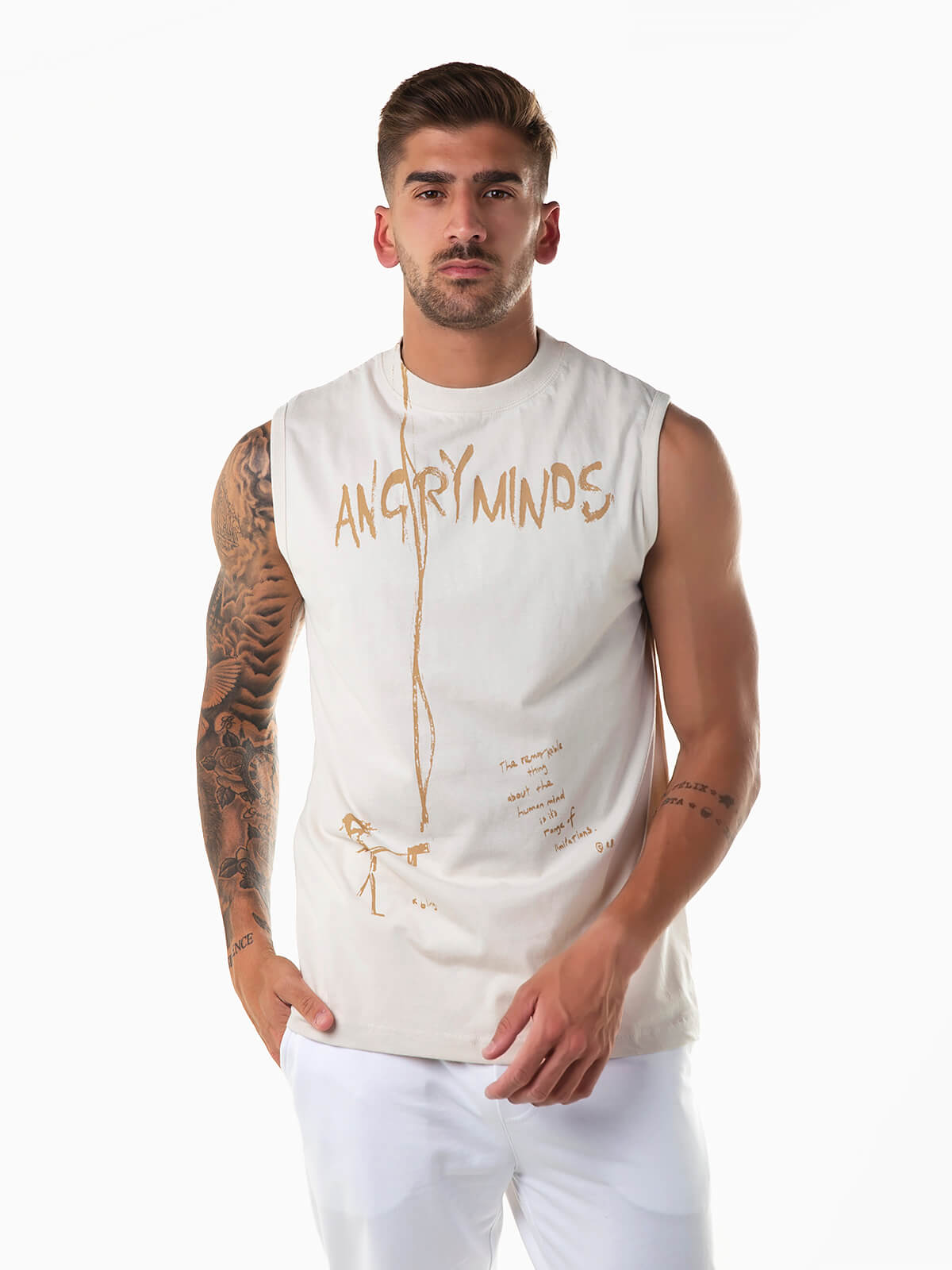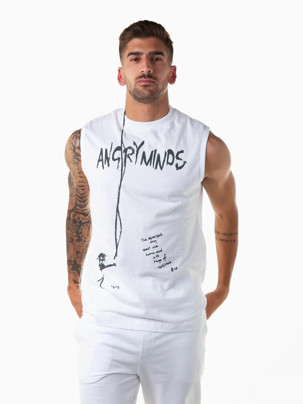 T-shirt sem mangas com motivos estampados. T-shirt para homem confecionada em tecido 100% algodão para maior conforto. Gola redonda.