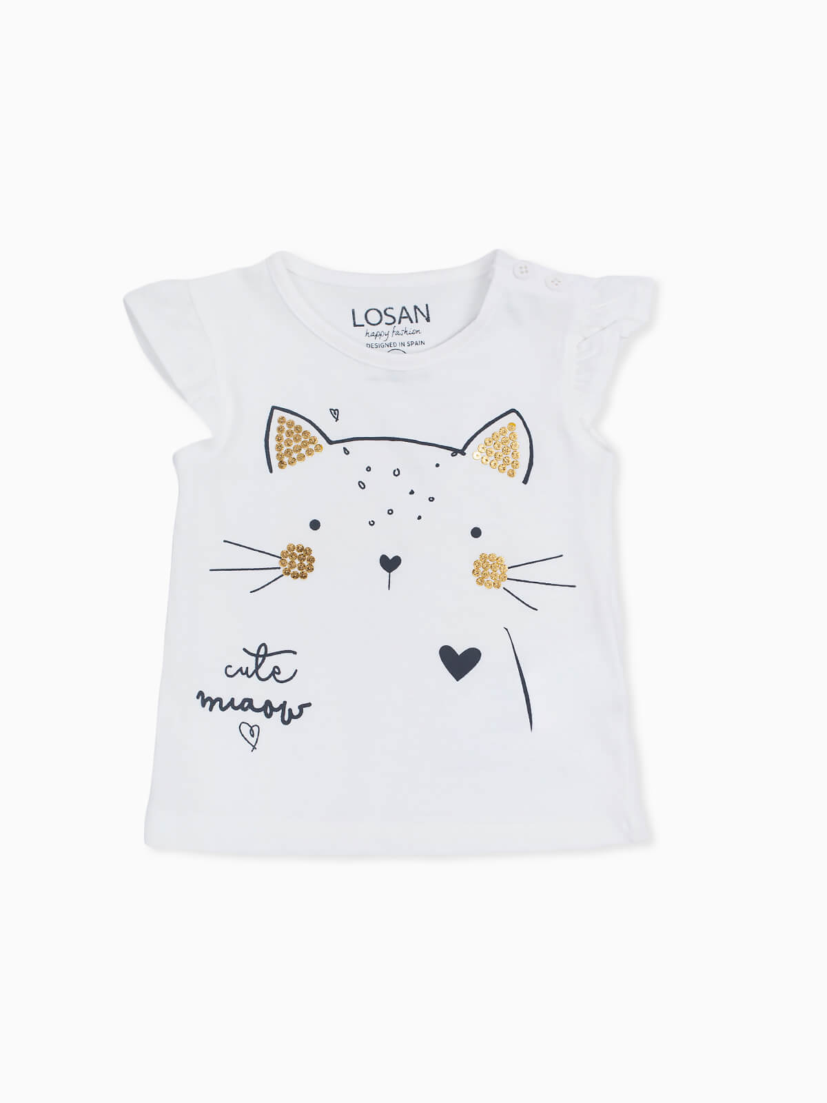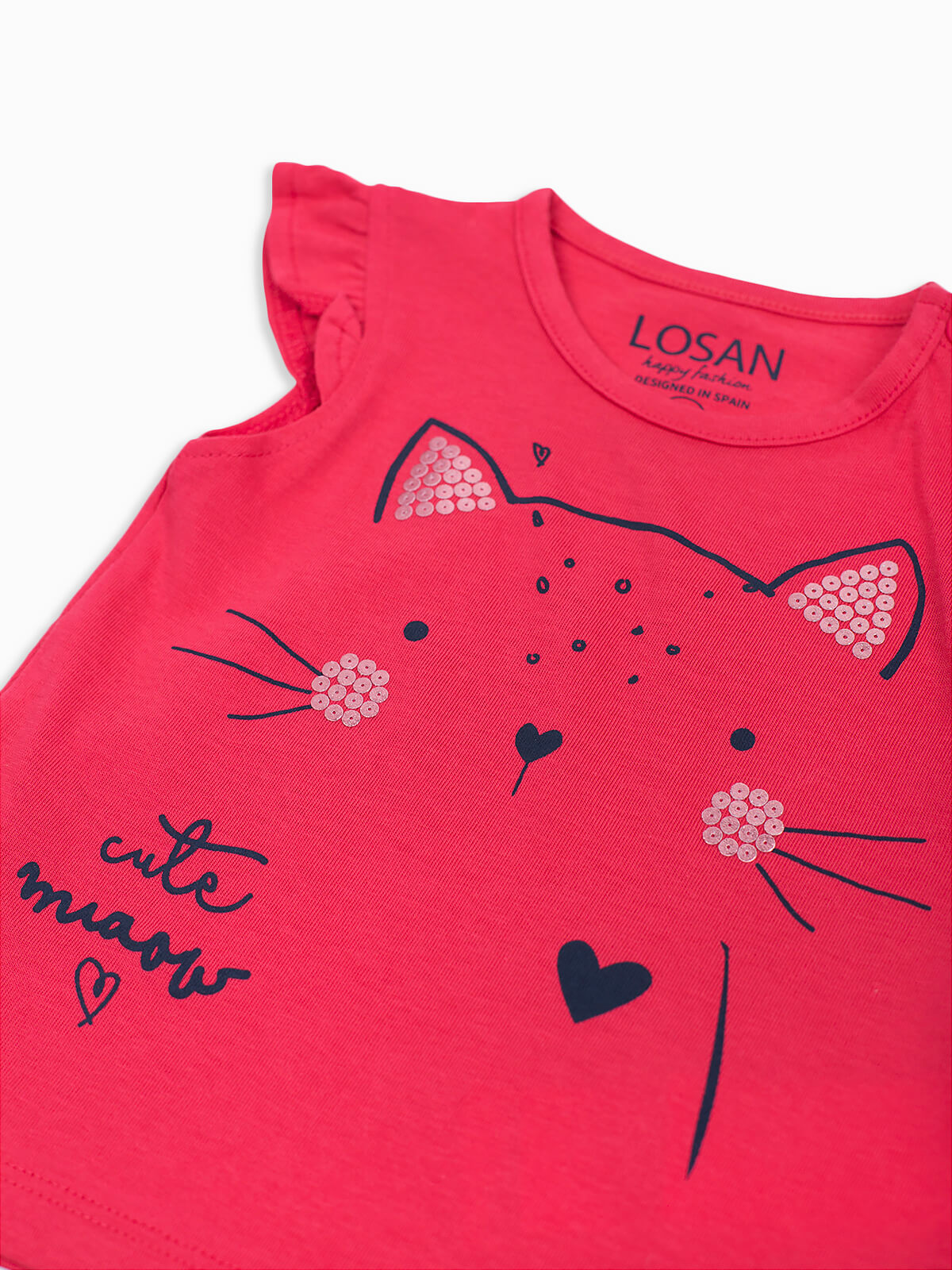 T-shirt sem mangas com folhos na cava. T-shirt estampada gato com lantejoulas. Botões no ombro. Gola redonda.