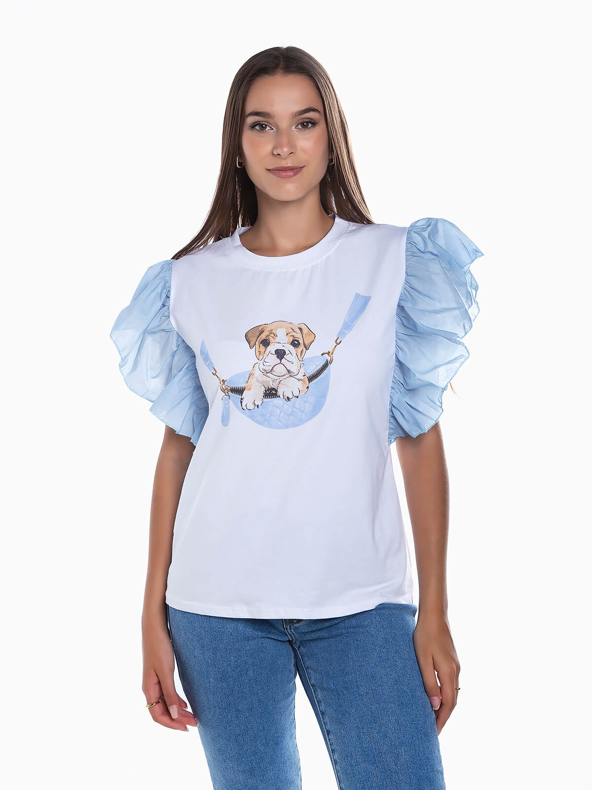 T-shirt sem mangas com estampado de cão e bolsa no peito. T-shirt em tecido de algodão com encaixe de folho na cava. Decote redondo.