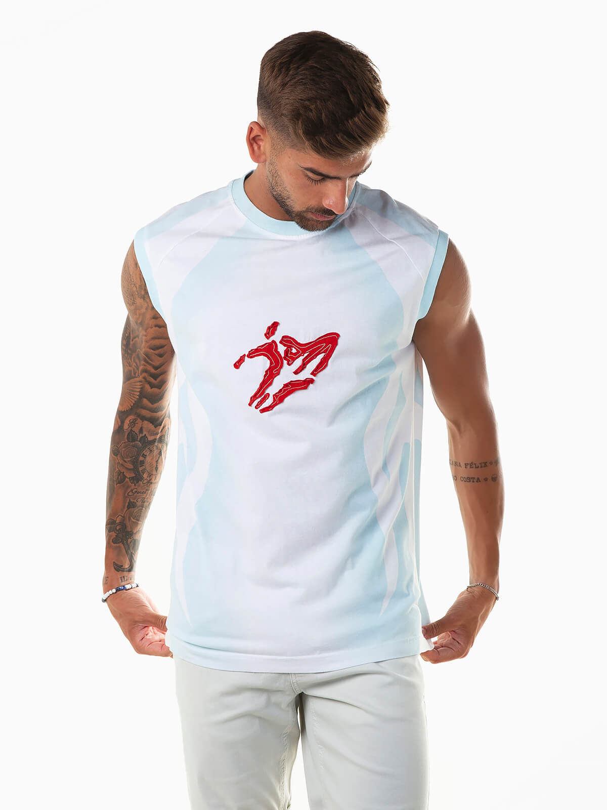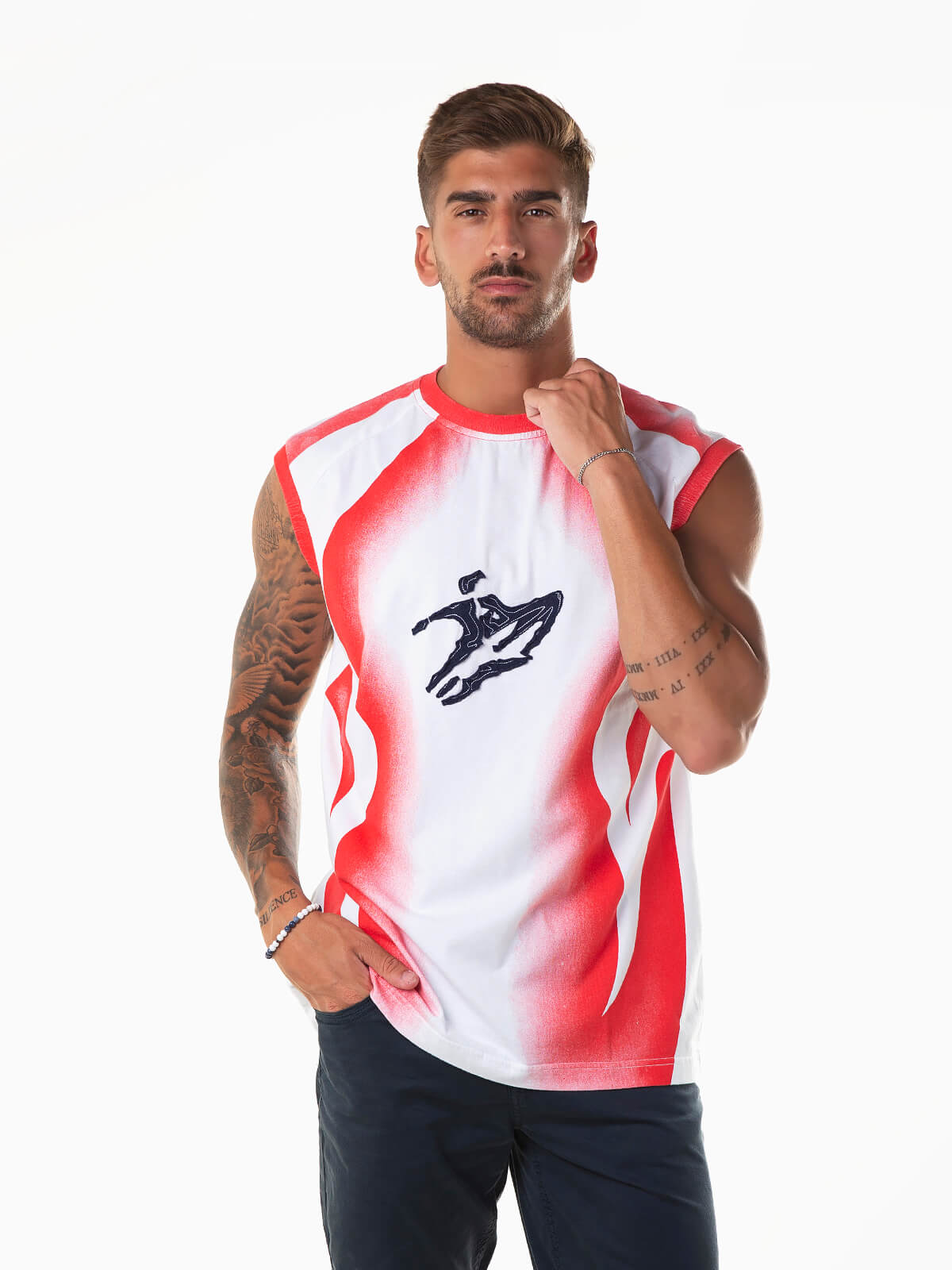T-shirt sem mangas para homem com pormenores desbotados e símbolo no peito. T-shirt com gola redonda.