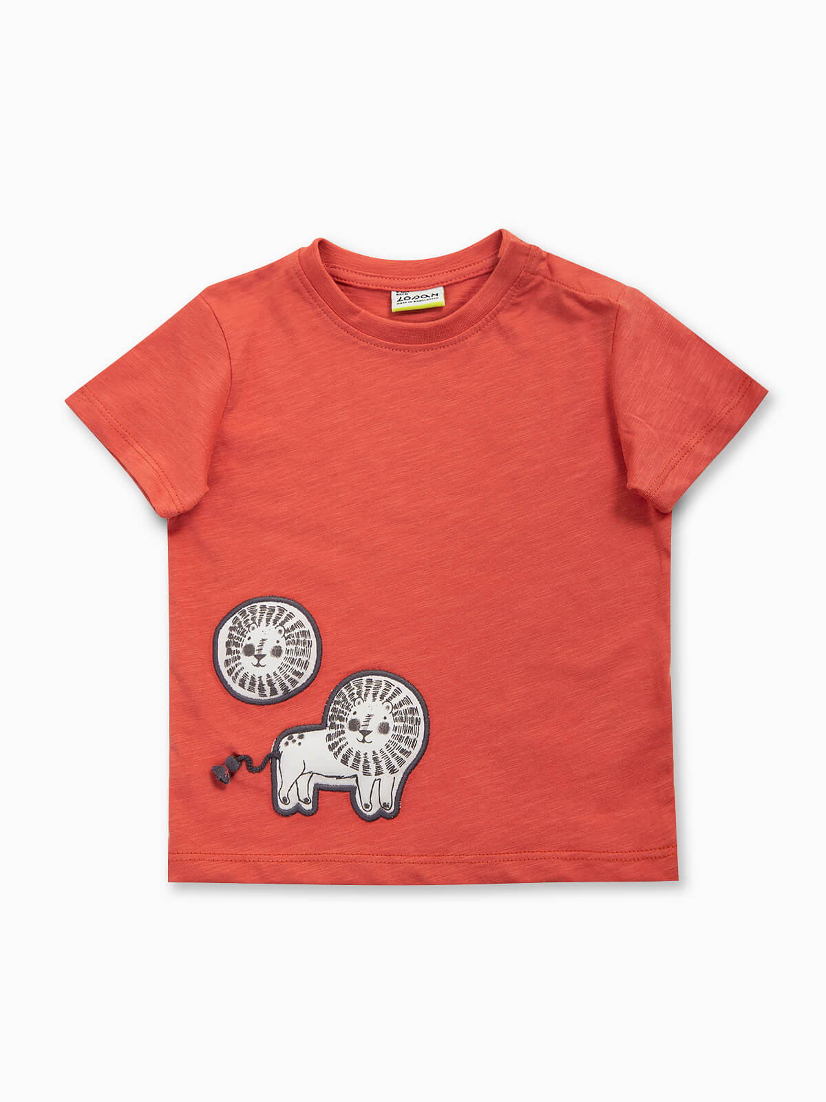 T-shirt telha de manga curta com leão almofadado bordado na lateral. T-shirt para bebé menino com gola redonda e aperto de botões mola.